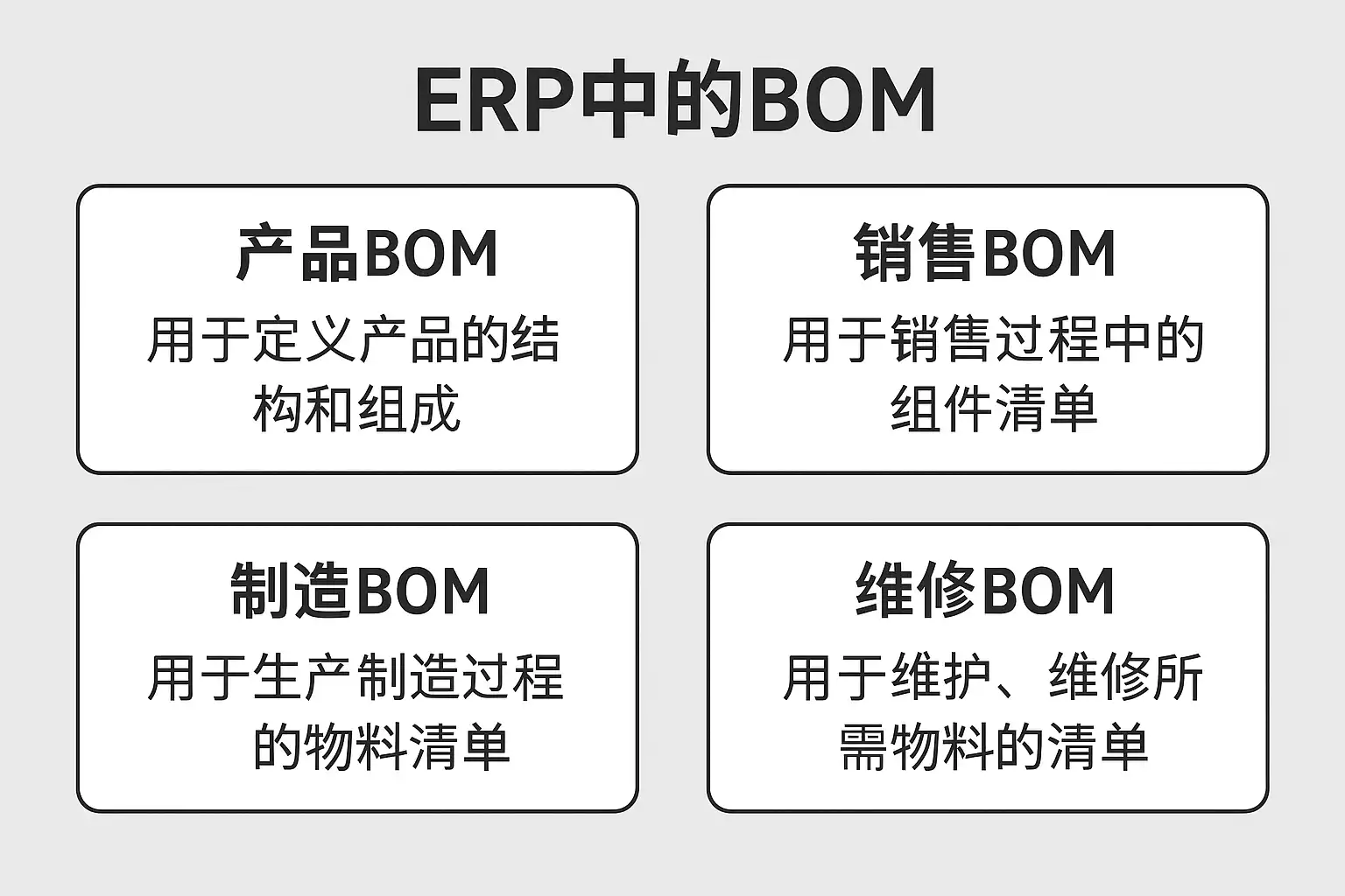 我在学习ERP系统时,发现BOM(物料清单)种类很多,但具体有哪些类型?它们分别适合什么场景?想知道ERP系统中常见的BOM类型,以便更好地理解和应用。
