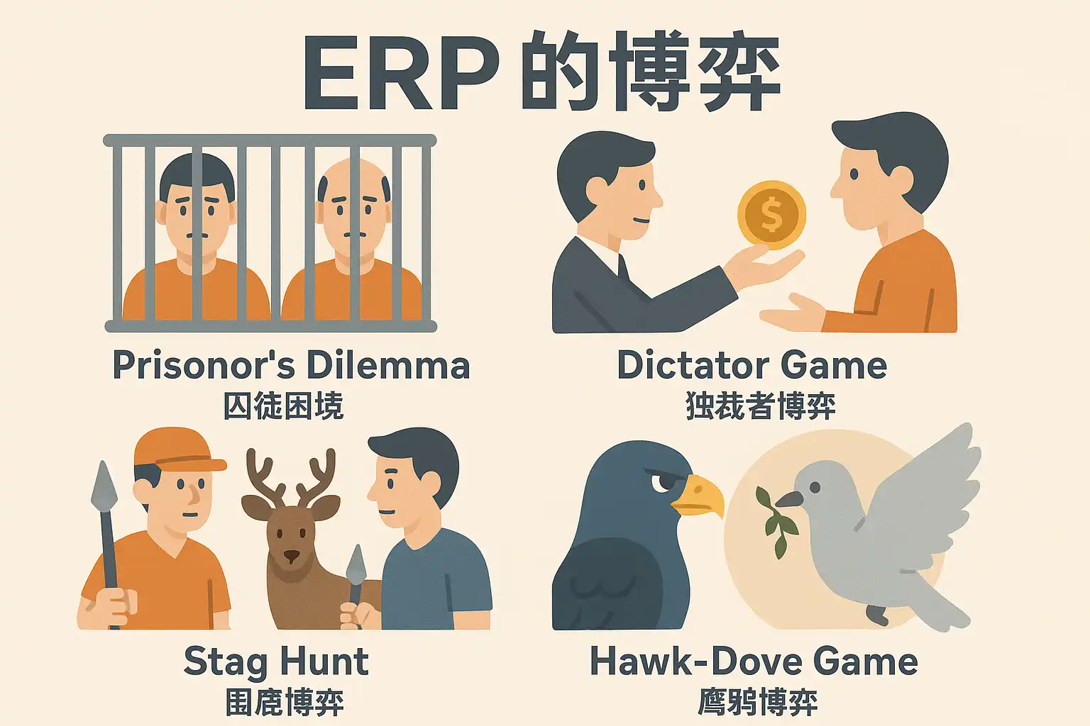 在ERP实施过程中,利益相关者(如高层管理、IT团队、业务部门、供应商)间存在多种博弈类型: