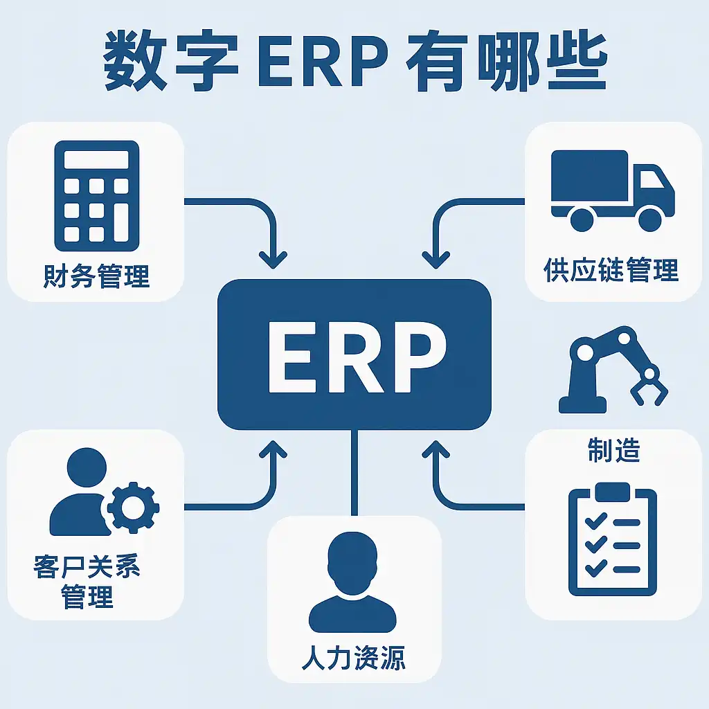 数字ERP(Enterprise Resource Planning)是利用数字化技术整合企业内部资源的管理系统,帮助提升运营效率。主要类型包括: