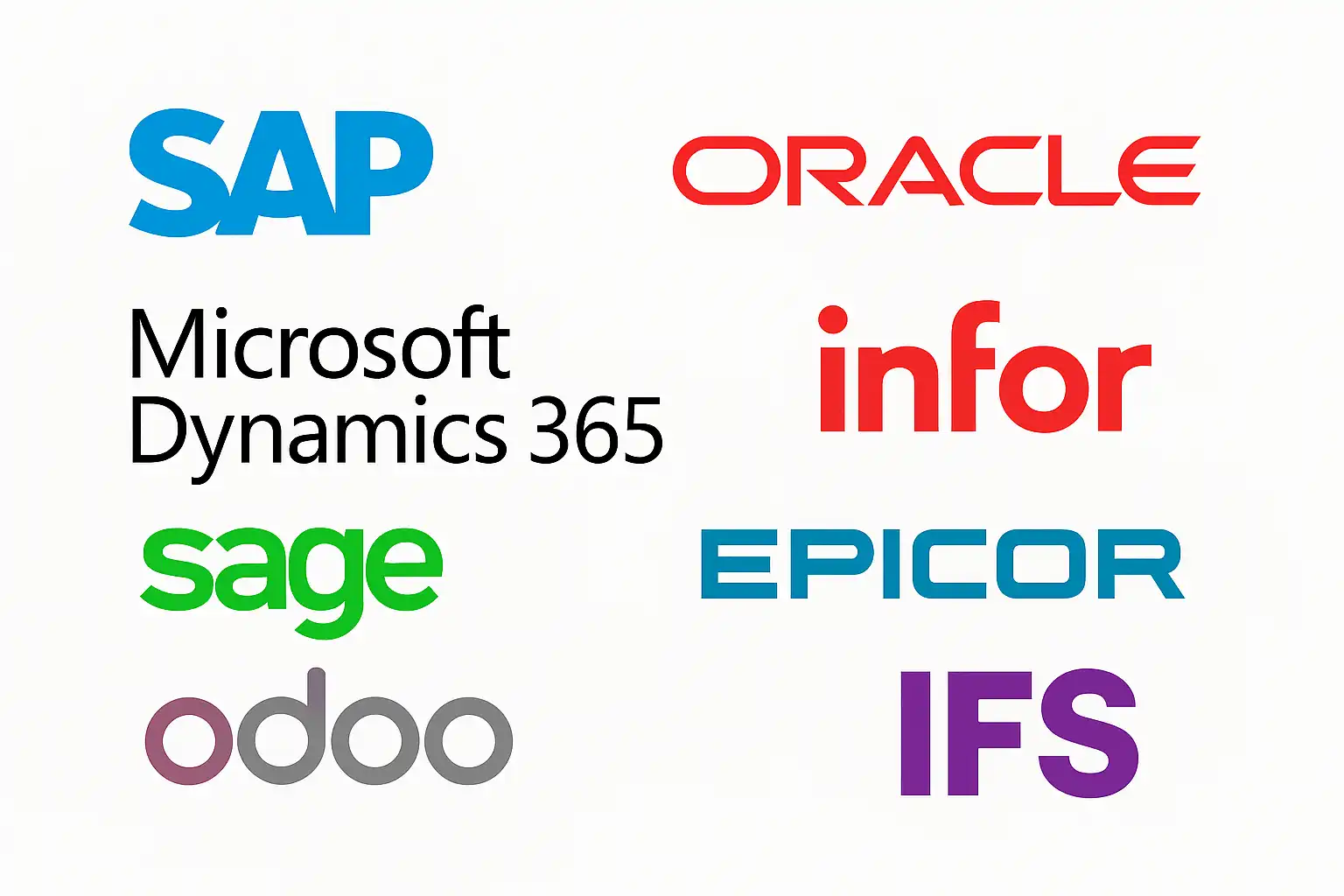 | 行业类型 | |-|-| 制造业 SAP S/4HANA, Oracle ERP Cloud, 用友U8/U9, 金蝶K3/KIS| 零售电商 Microsoft Dynamics365, 简道云, 金蝶星空| 服务业 Odoo, 简道云, Salesforce| 集团跨国公司 SAP S/4HANA, NetSuite, 浪潮GS|