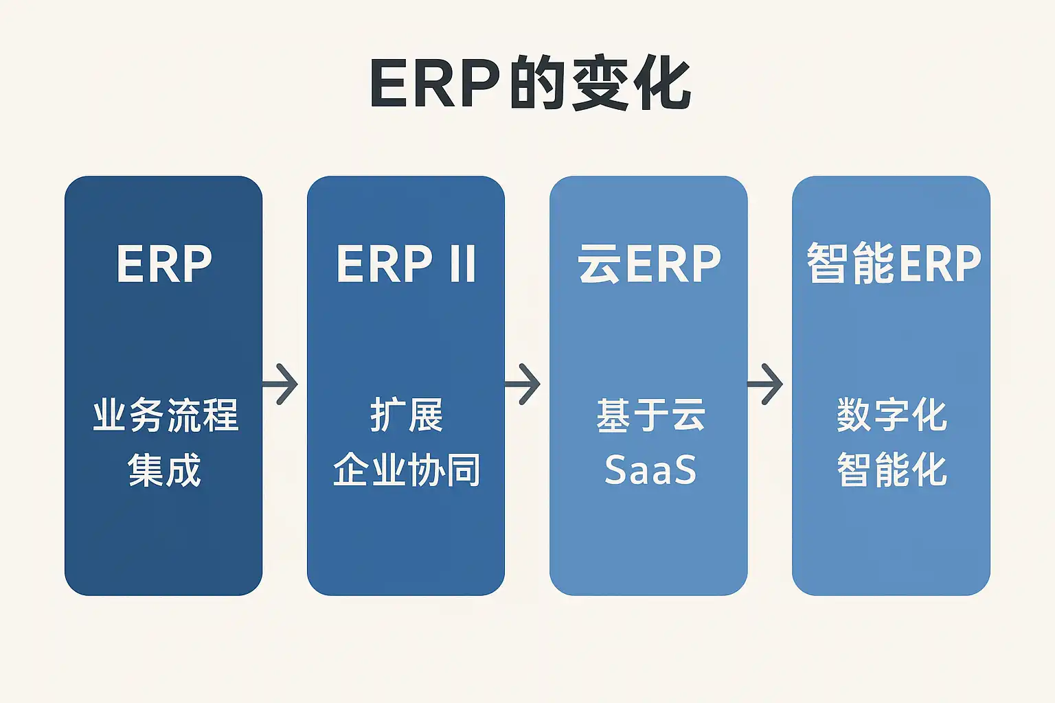 ERP(Enterprise Resource Planning,企业资源计划)自20世纪90年代诞生以来,不断融合新技术,以满足企业管理复杂度日益提升的需求。其发展大致经历如下阶段: