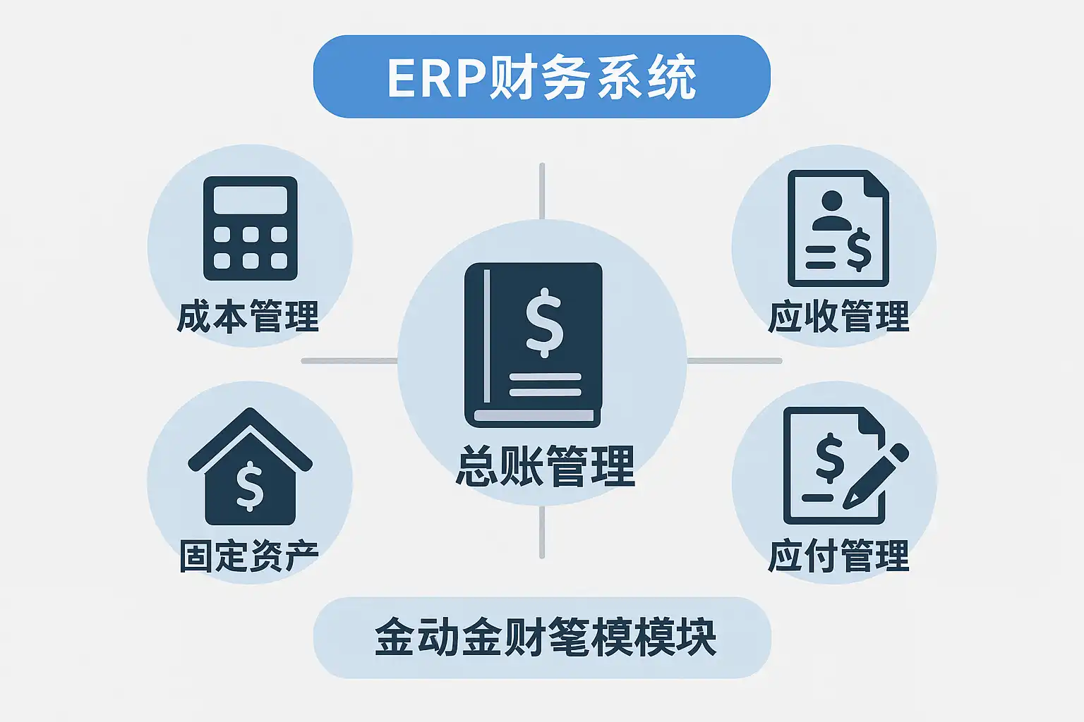 ERP(Enterprise Resource Planning)财务系统高度集成了企业日常经营活动中的各类资金流转与会计核算,其主要功能模块涉及如下: