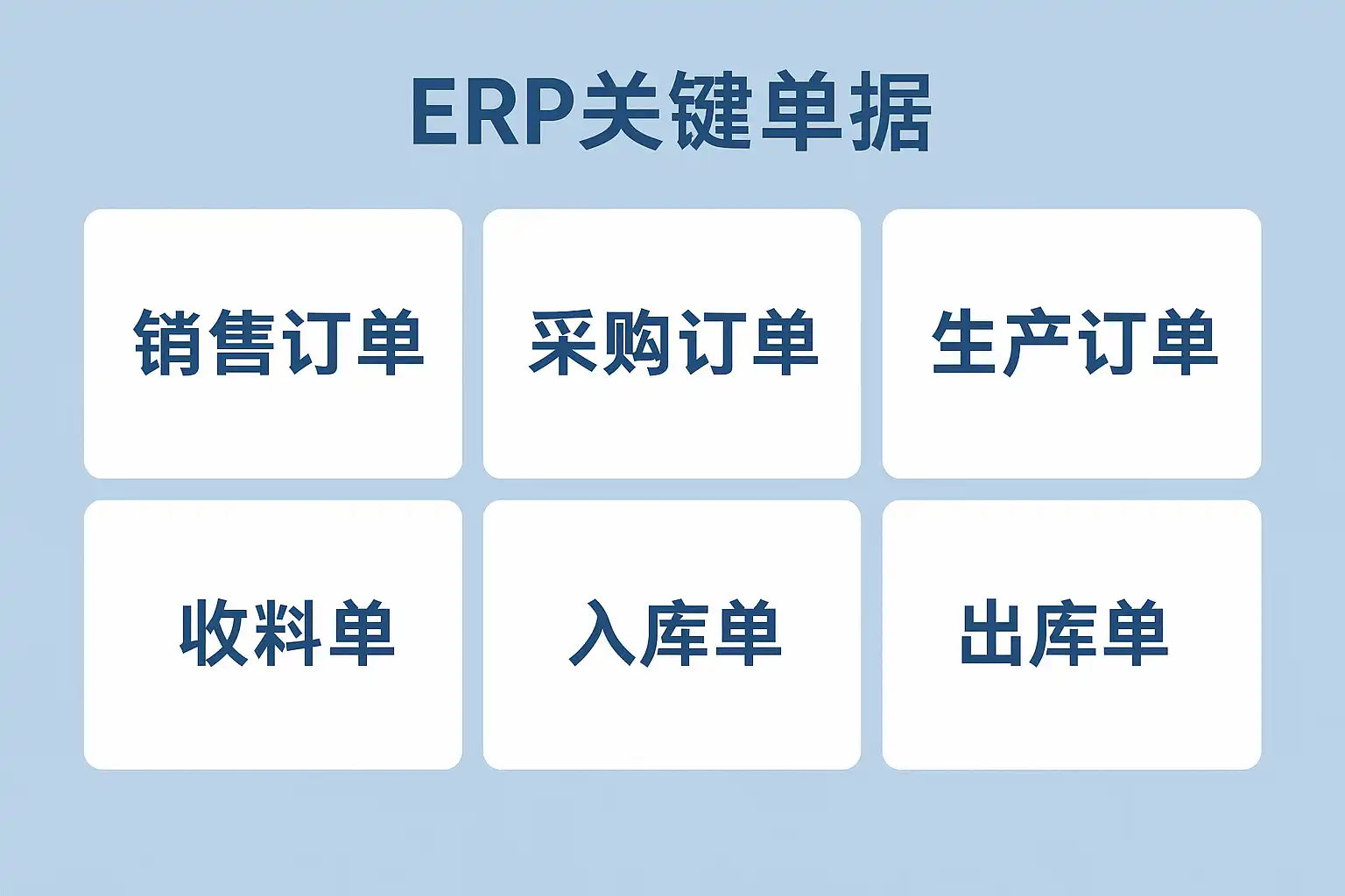 我最近开始接触ERP系统,发现里面有很多不同类型的单据,但不知道哪些是关键单据。能否详细说明ERP系统中通常有哪些关键单据?