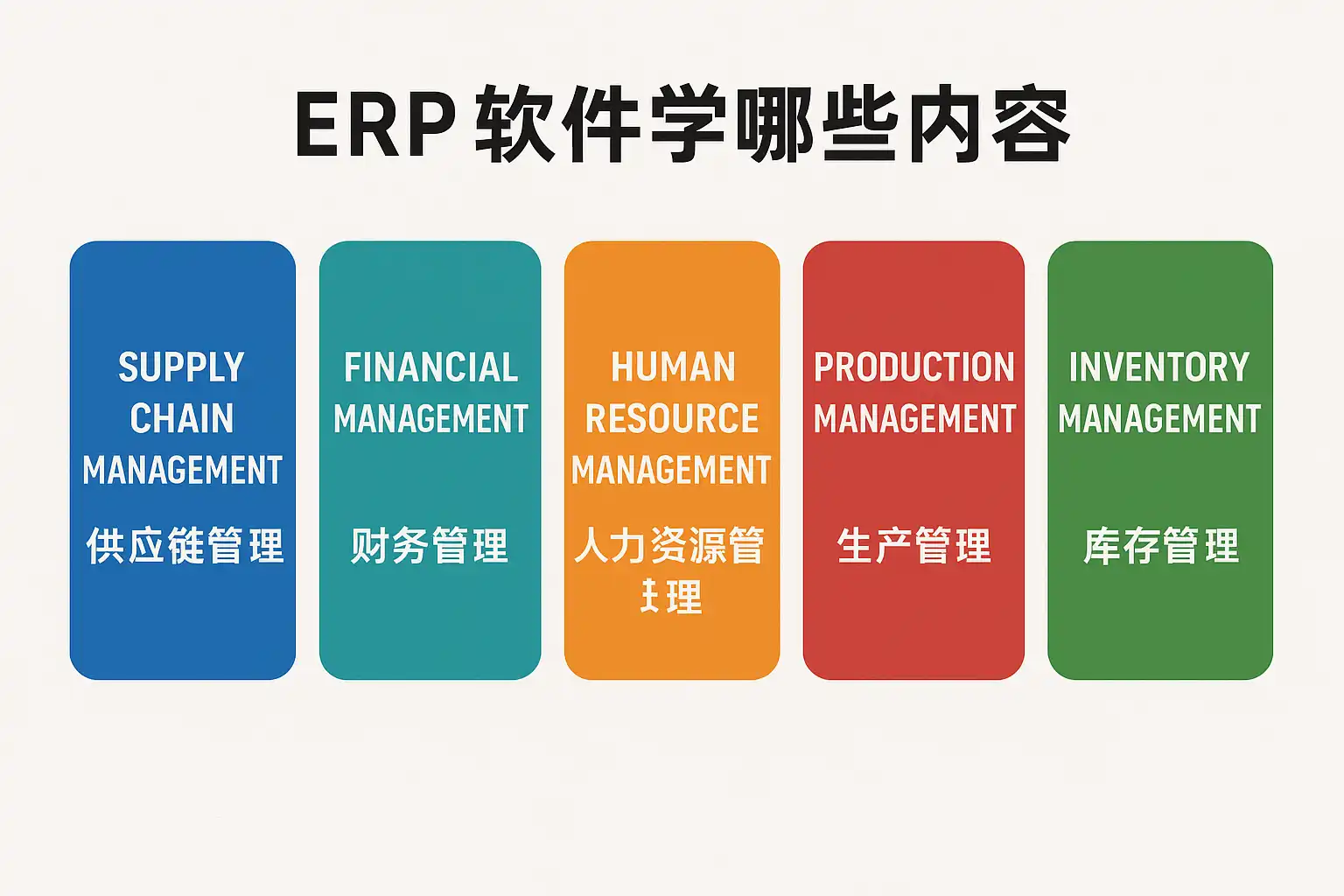 学习ERP软件时,核心模块包括财务管理、供应链管理、生产制造、人力资源管理和客户关系管理(CRM)。