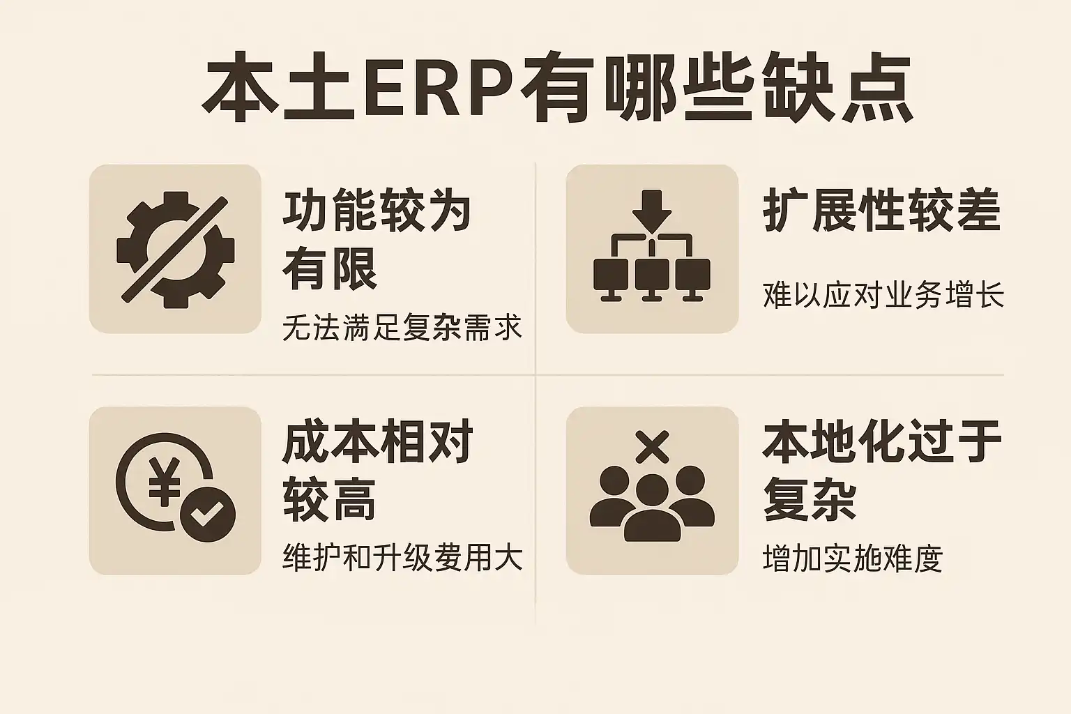 在选择本土ERP系统时,不少企业发现其在功能和服务上与国际主流产品存在差距。以下以列表形式梳理本土ERP常见的主要缺点:
