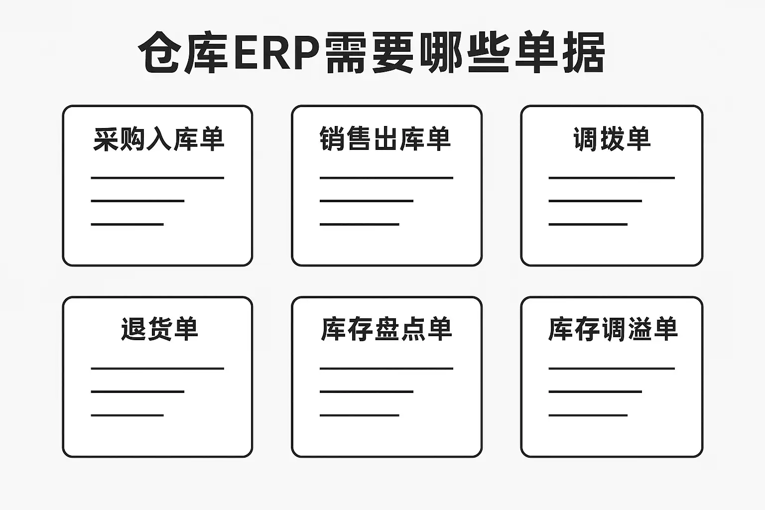 | 退货入库单 | 客户或门店退回商品重新进入仓储 | 单号、退货原因等 |