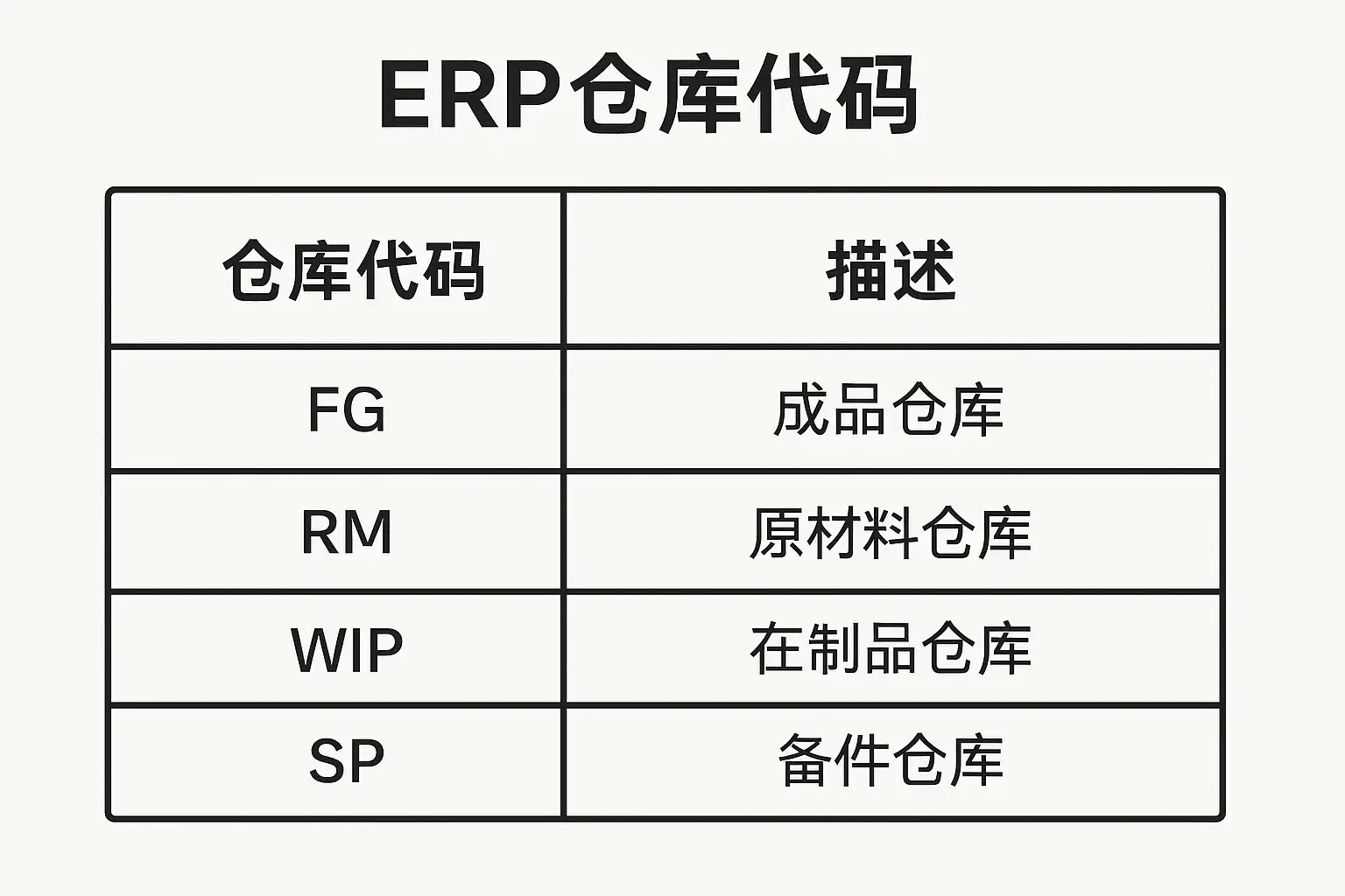 | 成品仓 | FG001 | 存放已生产完毕待发货销售的商品 |
