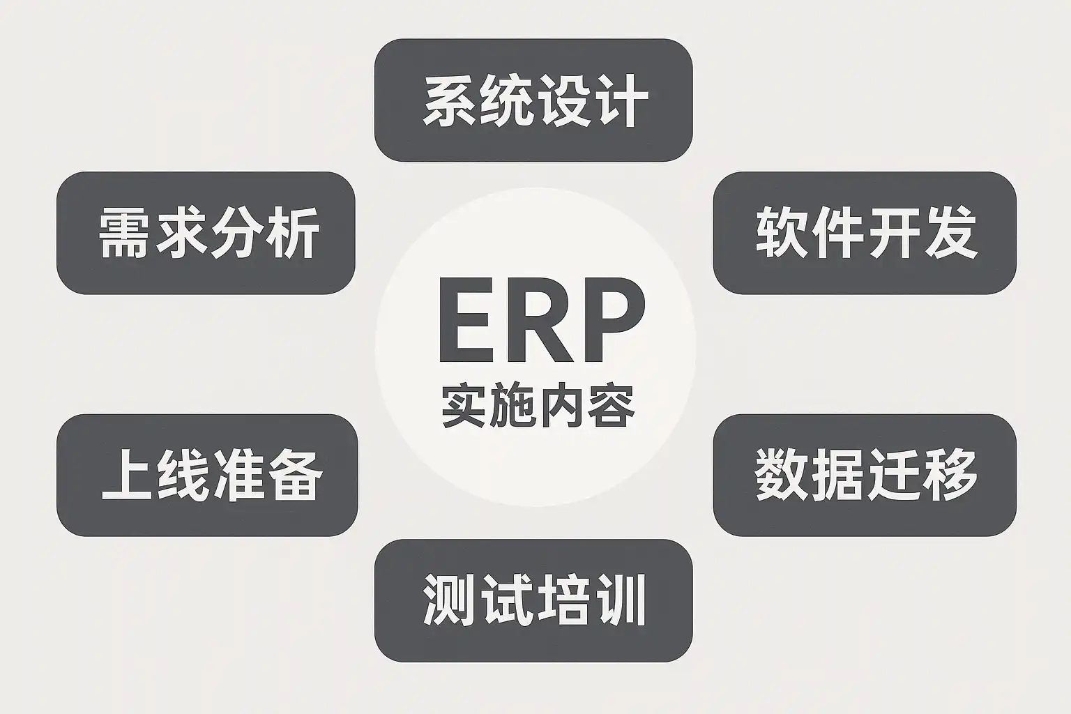 ERP实施内容主要包括需求分析、系统设计、软件开发与定制、数据迁移、用户培训和上线支持六大步骤。