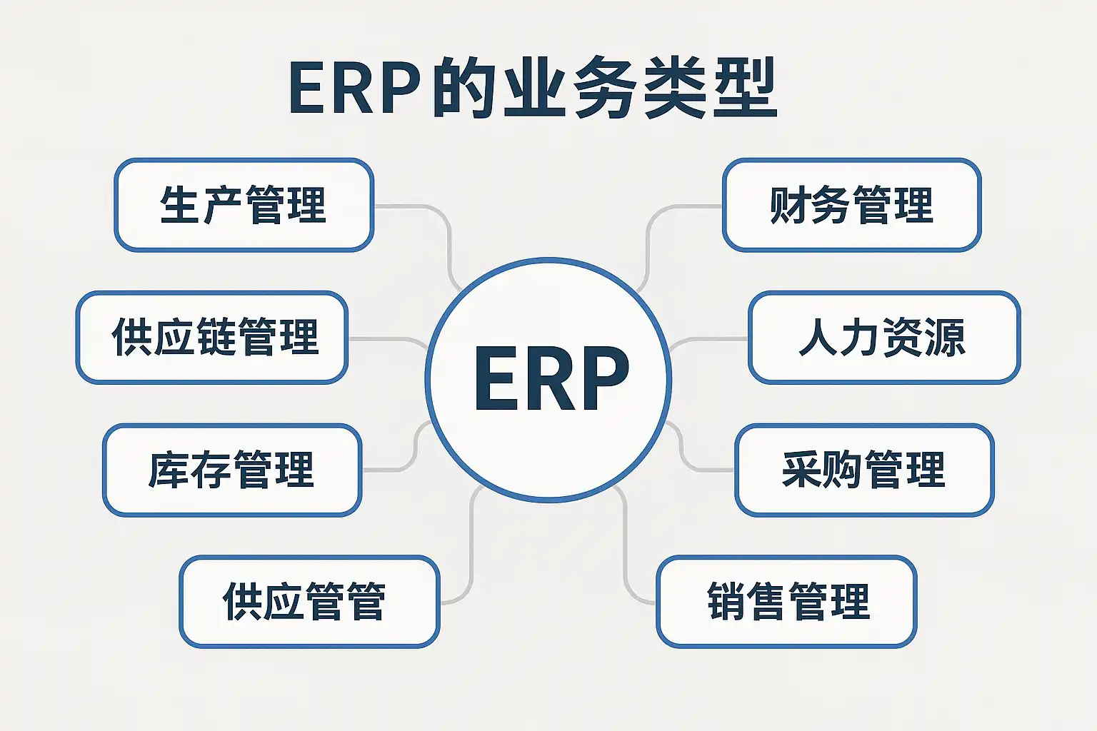 ERP系统之所以成为现代企业不可或缺的数字化工具,是因为它集成了众多关键业务流程。以下为常见ERP系统涉及的主要业务类型: