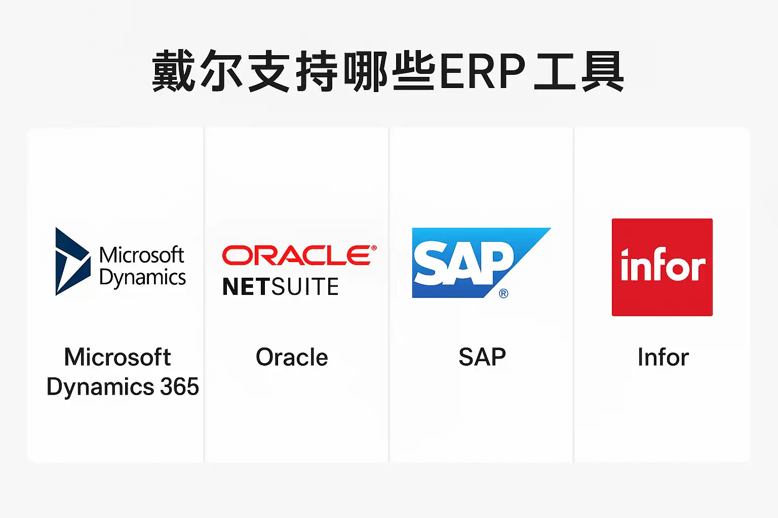 戴尔支持多种主流ERP工具,涵盖不同规模和行业需求。主要包括: