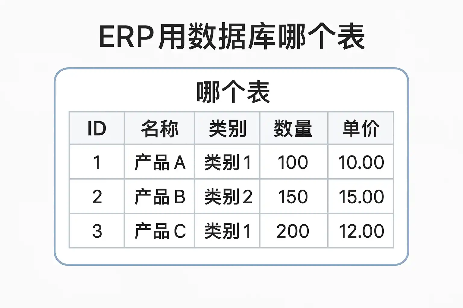 | 业务单据表 | 记录采购/销售/出入库等具体业务行为 | 单据编号、日期、关联客户/供应商ID |
