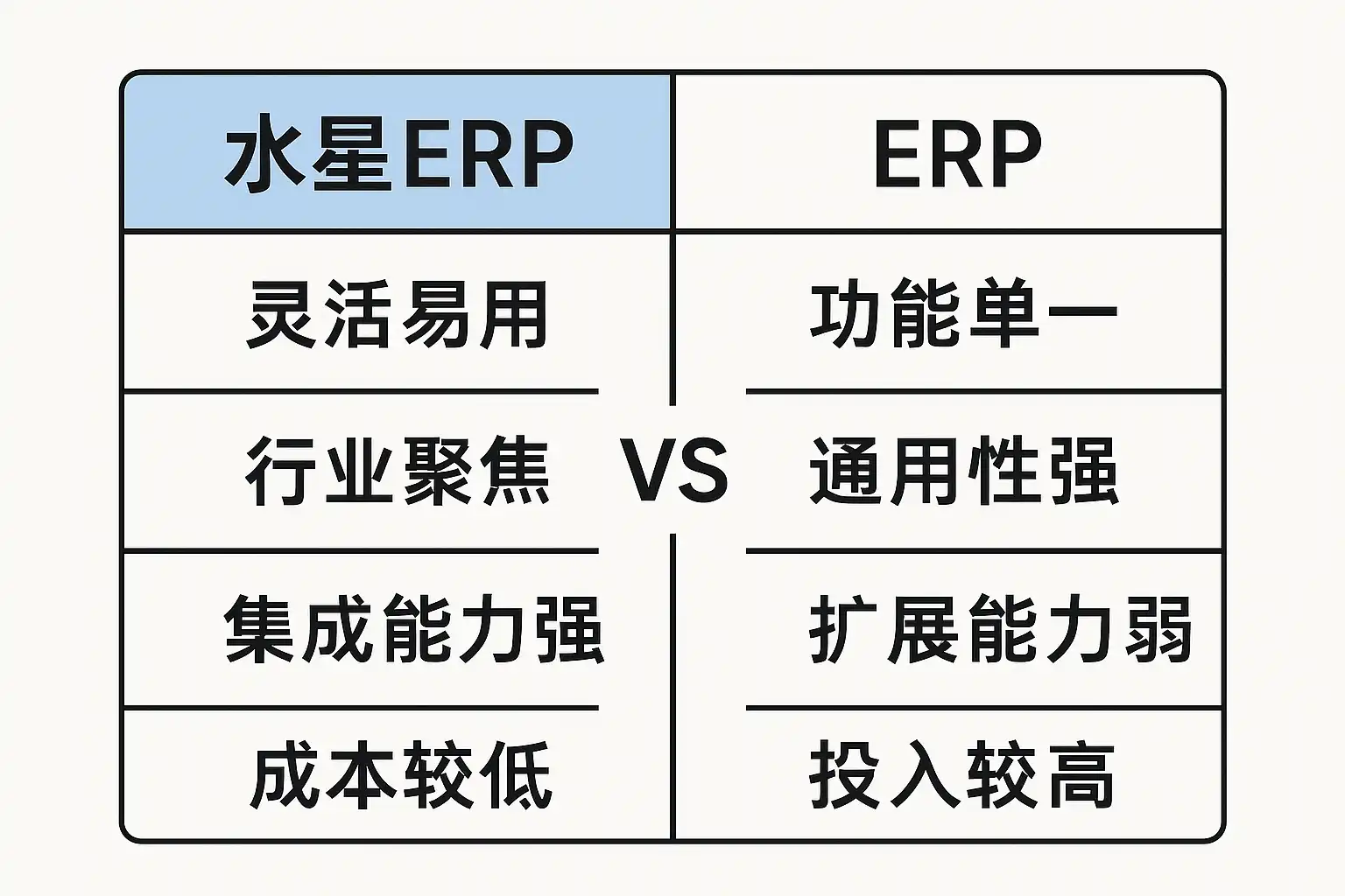 | 维度 | 水星ERP优势 | 水星ERP局限 | 通用型ERP优势 | 通用型ERP局限 |