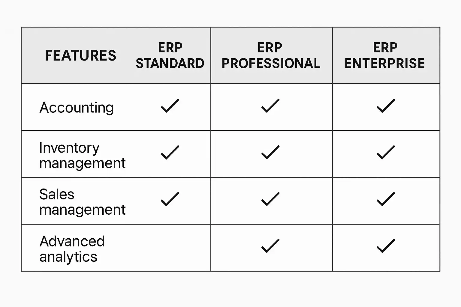 | 功能模块 | 基础财务、采购、销售 | 增加制造、项目管理、多币种支持 | 包含BI分析、高级定制化及集成 |