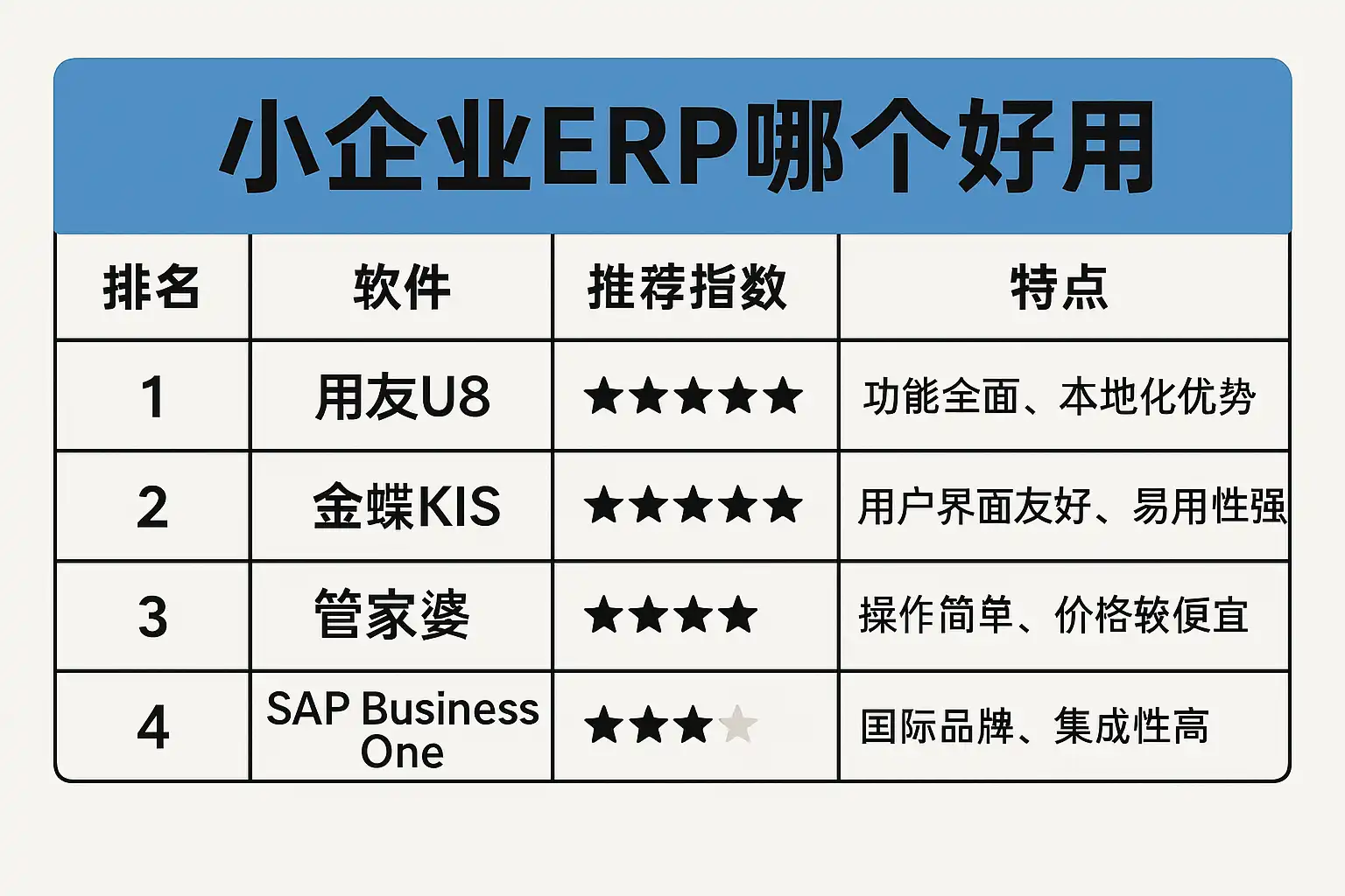 下表列出了小型企业在选择ERP时最看重的核心要素,并针对主流产品进行横向对比: