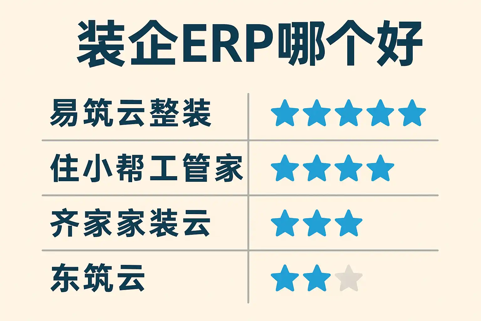 目前国内主流的装企ERP产品主要有:简道云ERP(金蝶生态)、金蝶KIS云·建筑版、用友U8/NC建筑行业方案,以及管家婆工贸版等。下表从功能完备性、自定义能力、上手难易度和价格区间进行横向对比: