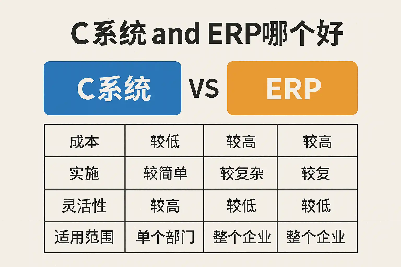 | 对比项 | C系统优势 | C系统不足 || ERP优势 || ERP不足 | |-------------|--------------------------|--------------------------||-----------------------------||----------------------------| | 聚焦深度 | 专注单一领域,高度专业 | 数据孤岛、多套软件维护 || 一体化整合,信息共享 || 初期上线成本高 | | 上手难度 | 简单易学 | 易造成流程割裂 || 流程标准规范 || 推广落地需变革习惯 | | 灵活性 | 针对性强 有些变动灵活 || 拓展范围有限 || 可持续拓展,多模块组合 || 定制开发周期长 |