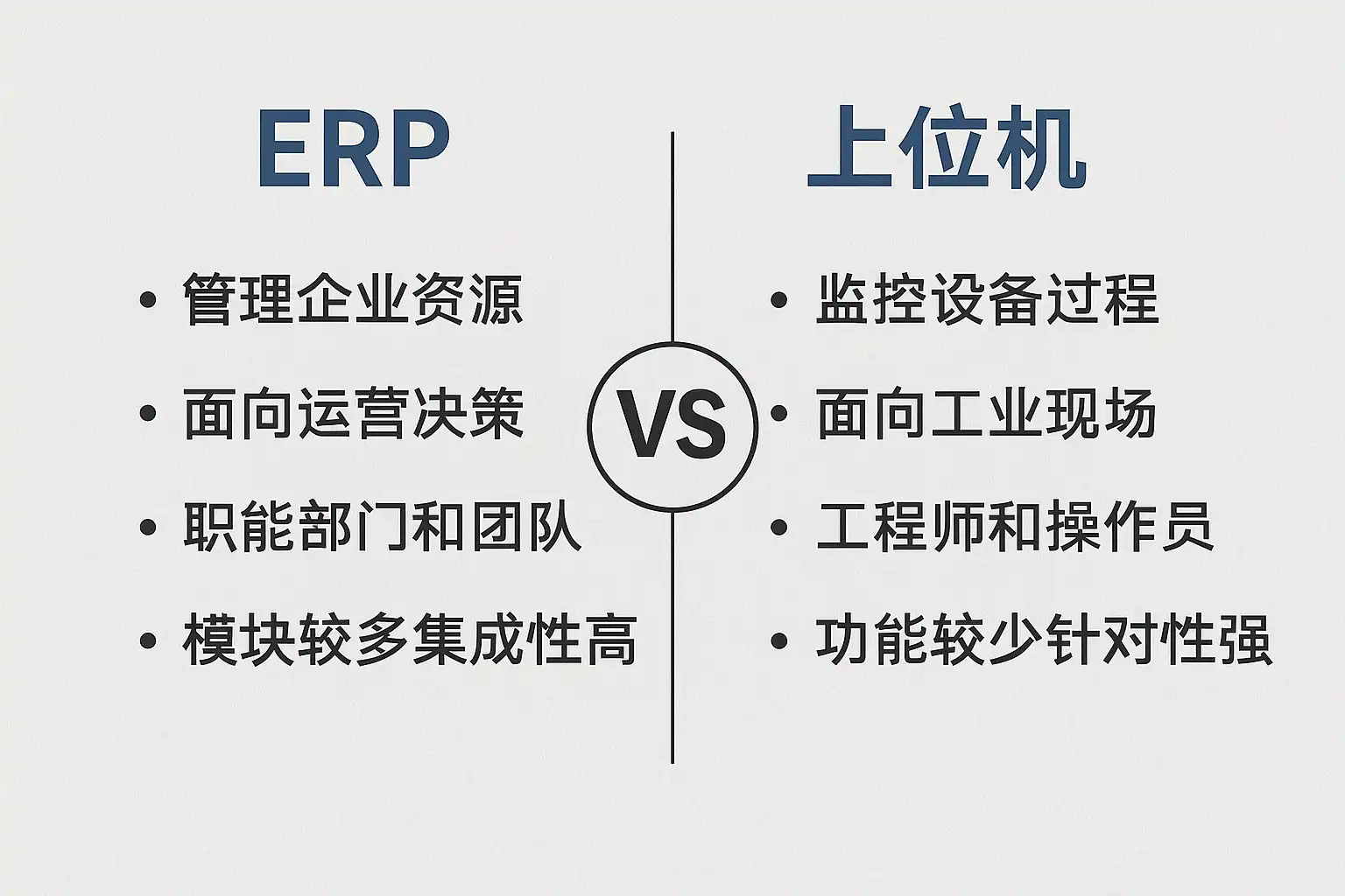 ERP(Enterprise Resource Planning,企业资源计划)和上位机(SCADA/HMI等)虽都用于提升企业管理水平,但本质定位截然不同。
