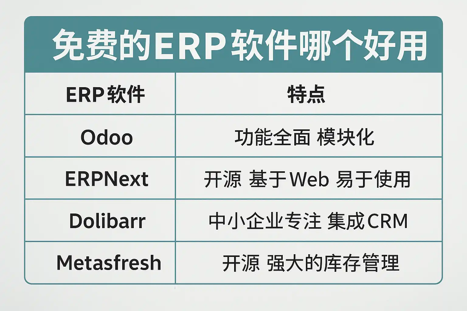 下面以表格形式更细致地对比其它热门免费ERP: