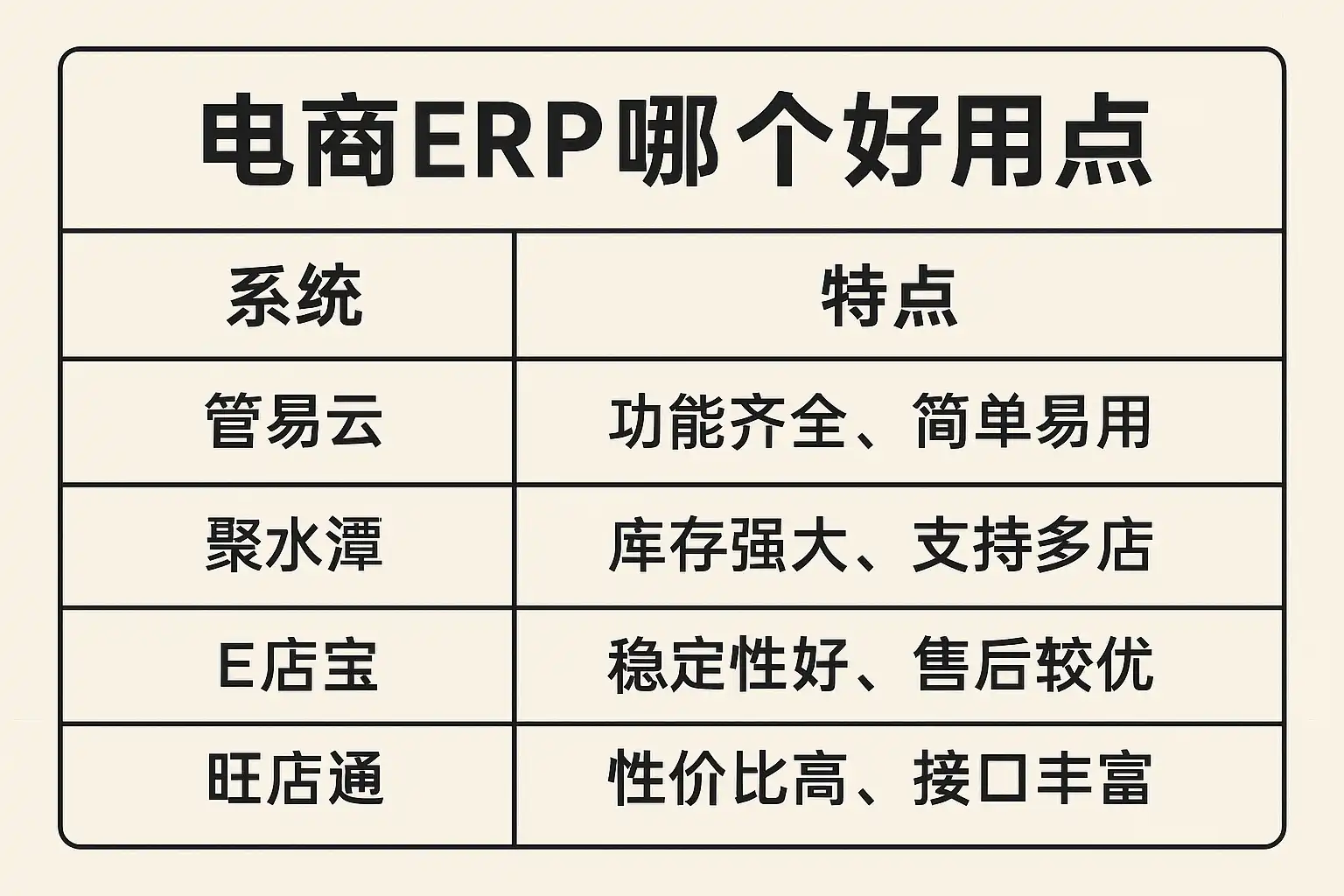 | 旺店通 | 电商专用强 | ★★★☆☆ | ★★★★☆ | ★★★☆☆ | 专做电商 |