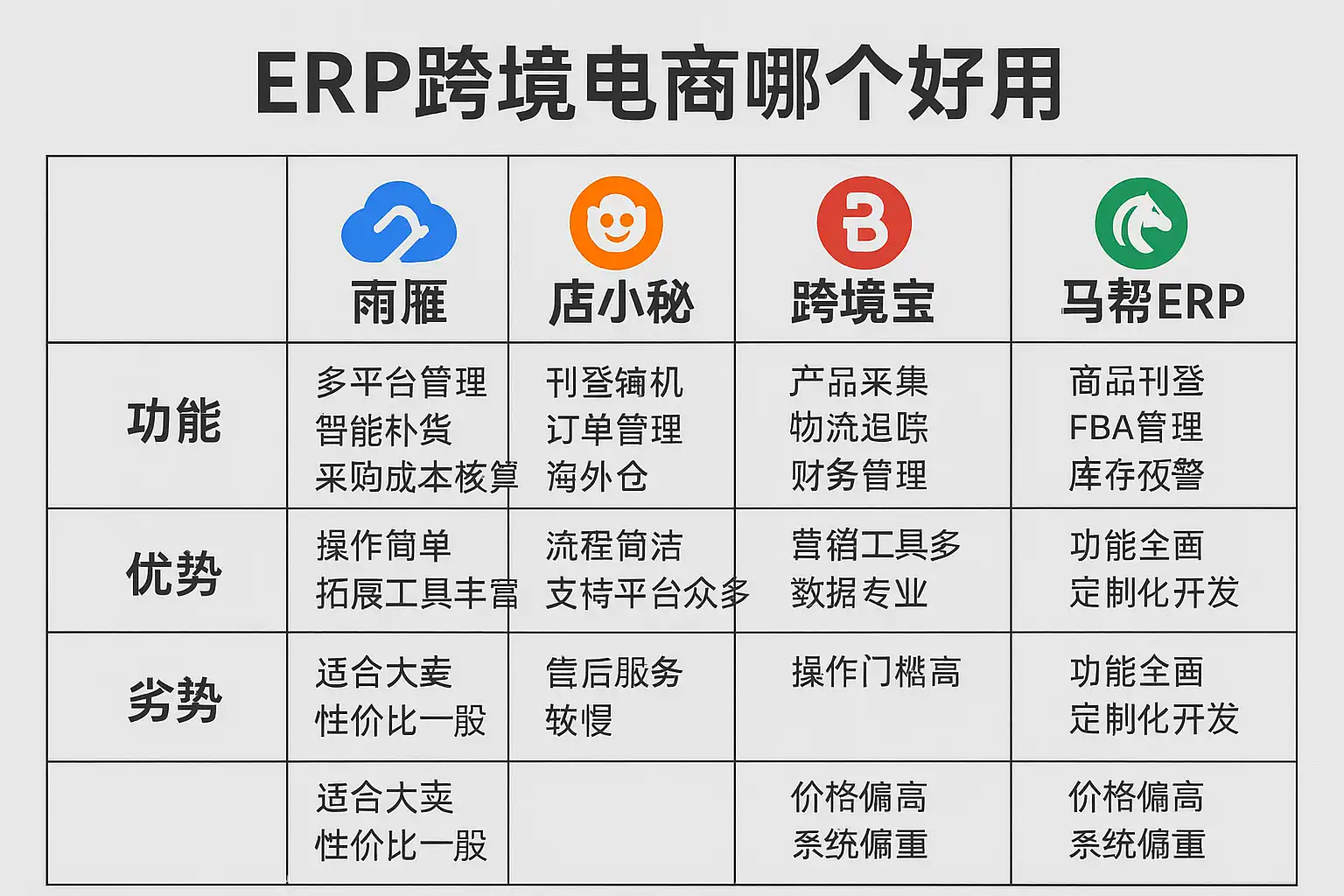| 马帮ERP | 海外仓/多店铺/物流深度集成 | Amazon/eBay/速卖通等 | 一般 | 中档 |