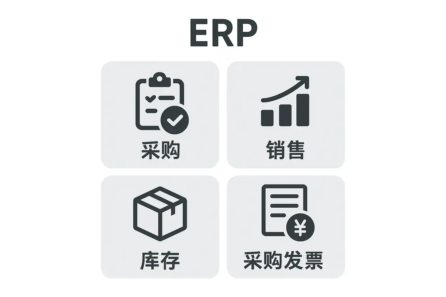 | 采购管理 | 供应商选择、下单、收货 | 发票录入、与订单/收货单自动匹配 |