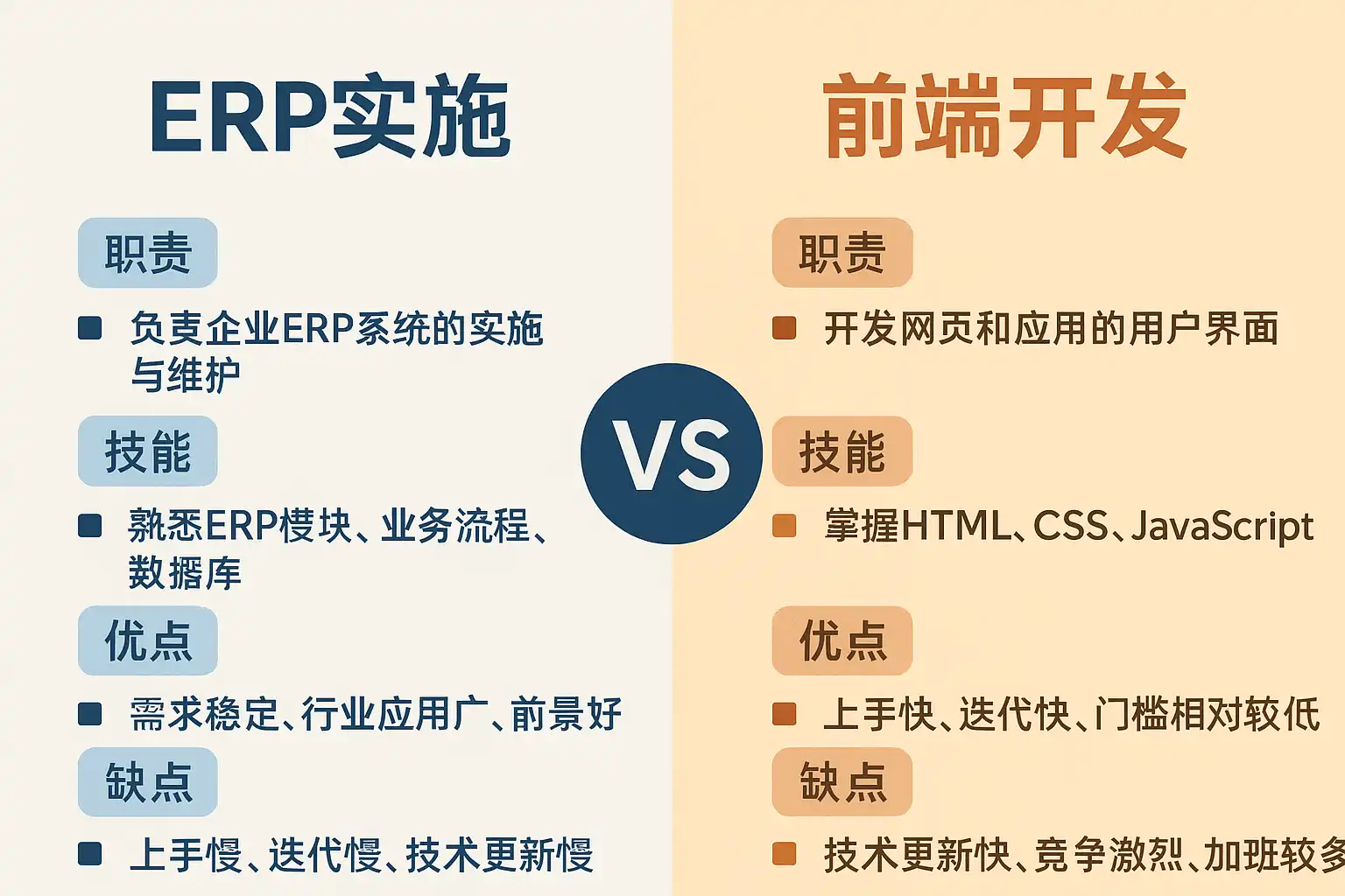 | 决策因素 | 更适合ERP实施 | 更适合前端开发 ||------------------|-----------------------------|---------------------------------------|| 喜欢组织协调沟通 | ✔️ | || 钟爱钻研编程 | | ✔️ || 渴望多行业跳槽机会| | ✔️ || 擅长分析业务流程 | ✔️ | || 注重薪资上升空间 | 部分头部企业 | 大多数大厂、中小创新公司 |