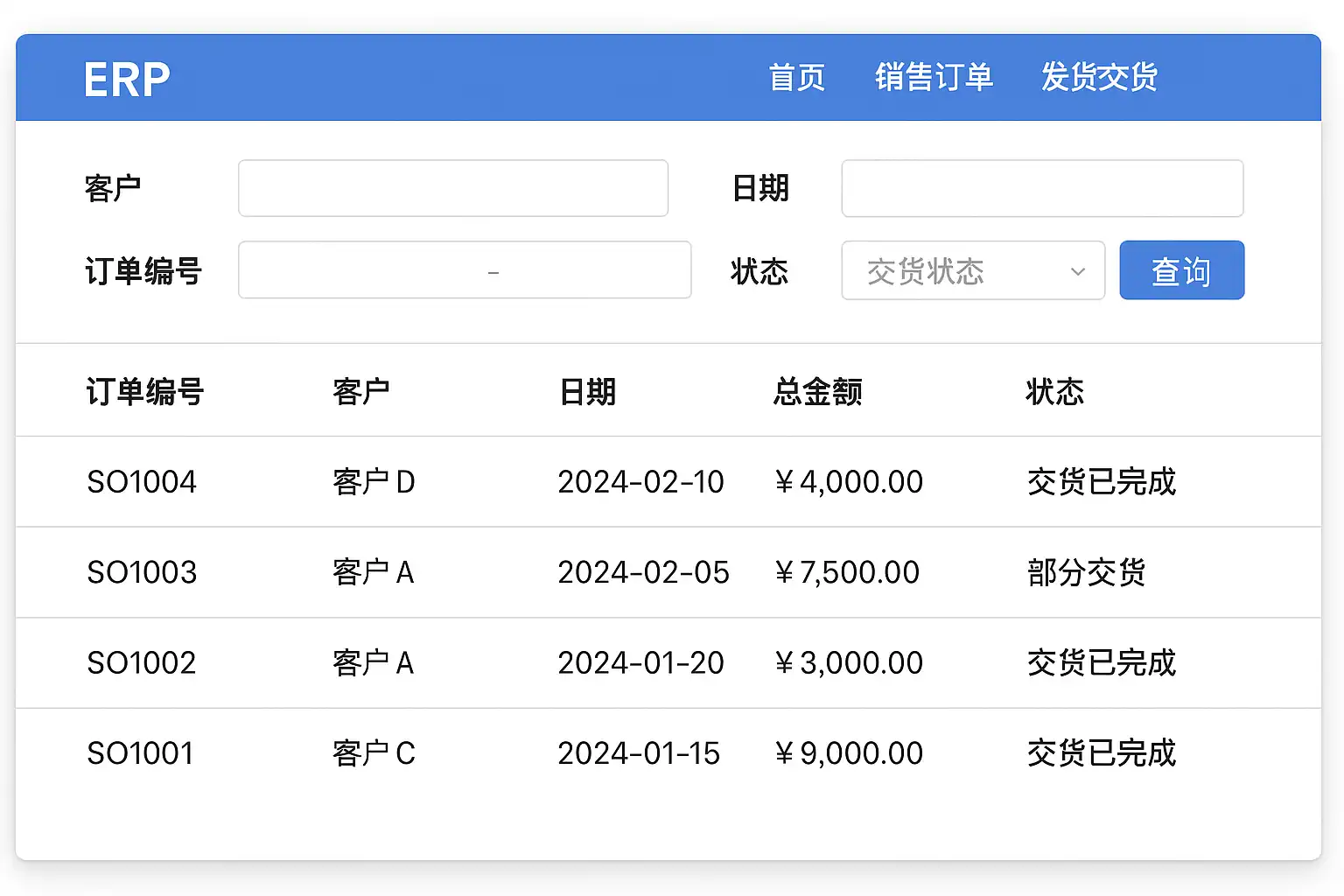 | 销售发货单界面 | 常规出库和业务跟踪 | 可批量查询和筛选所有出库及交付情况 |