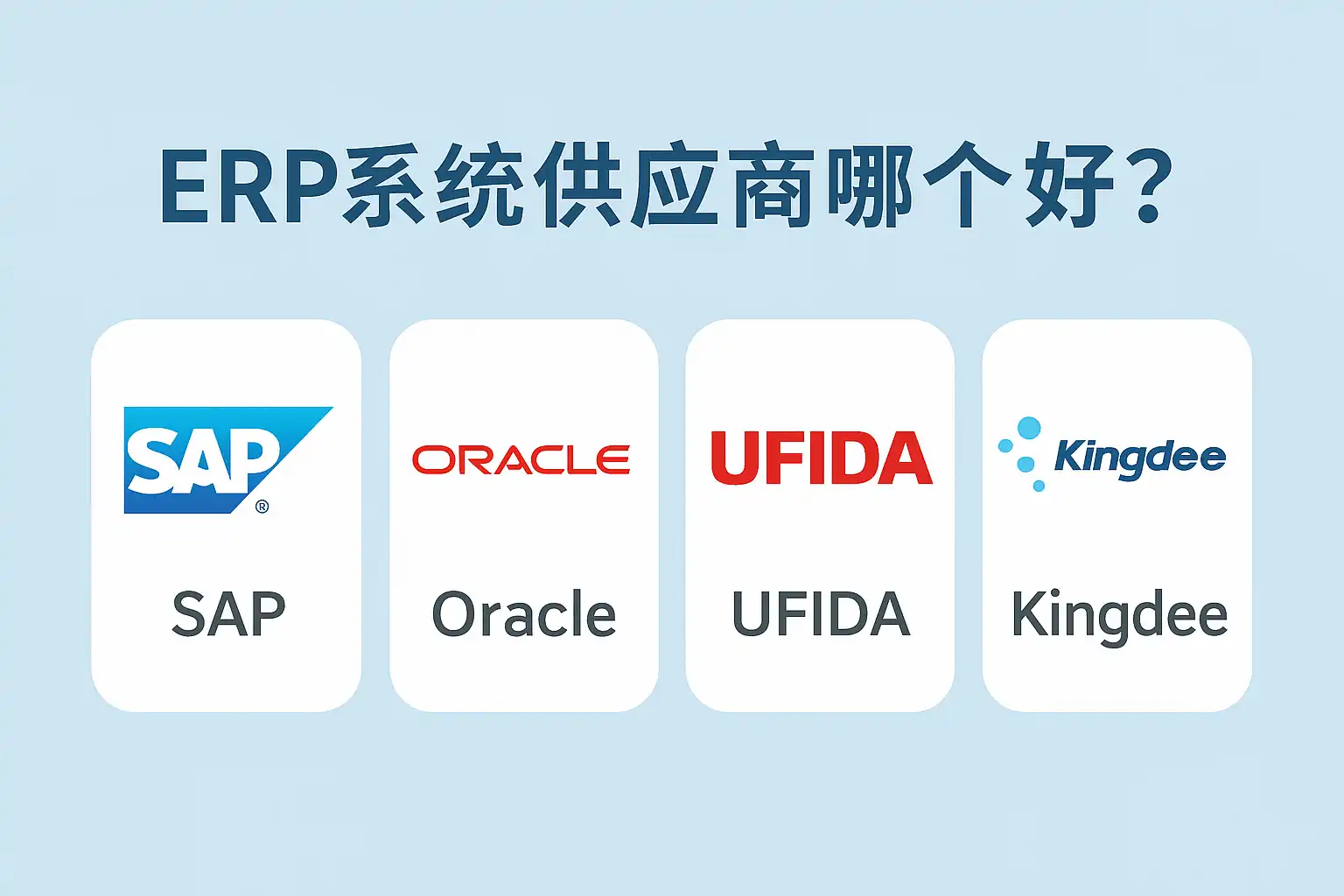 | 厂商品牌 | 优势标签 | |-------------: -----------: | SAP 国际标准,多组织多账套,可扩展全球布局 | ORACLE 高端金融分析、安全体系完整 | 用友网络 国企央企信任,本土政策兼容好 | 金蝶软件 小微易用,本地+公有混合部署 | 简道云 零代码快速上线,自主配置灵活 |
