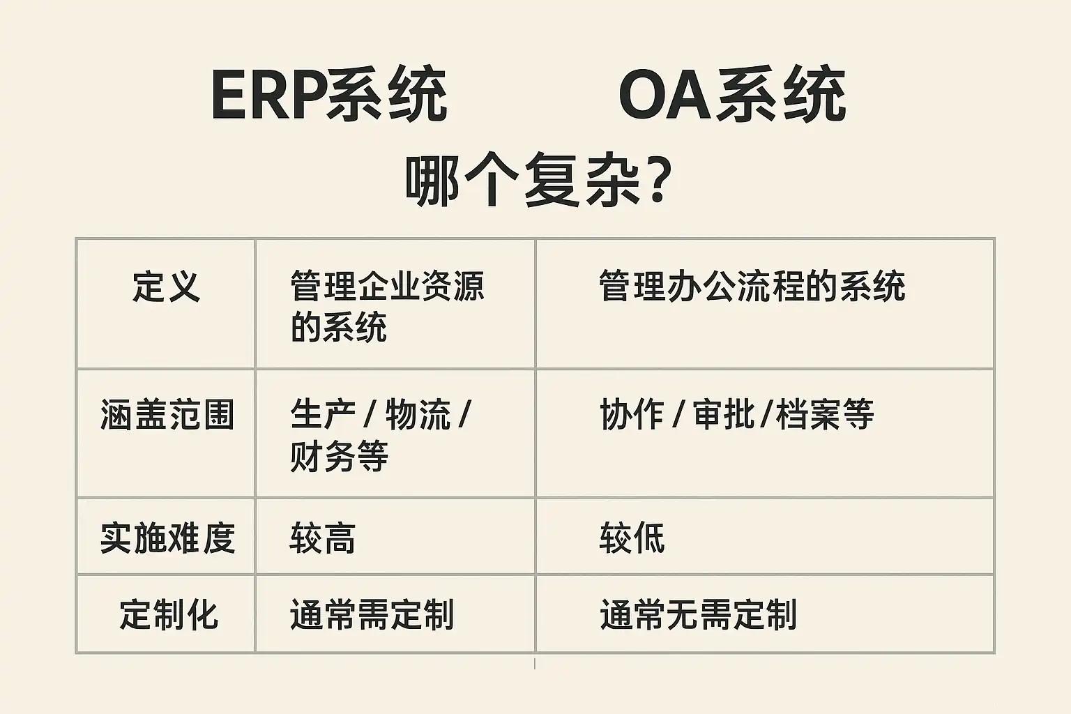 作为一个刚接触企业信息化的管理者,我常常困惑ERP系统和OA系统在复杂程度上有什么区别?我想知道这两者在功能和实现难度上的差异。