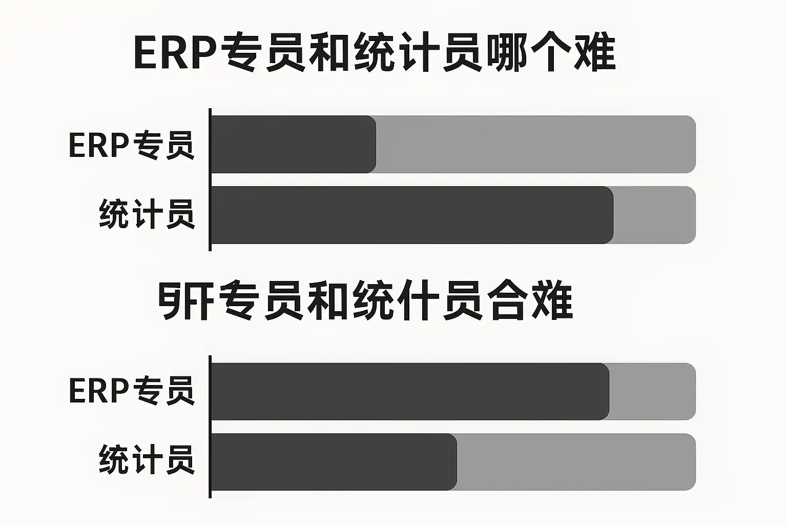 我一直在考虑职业发展方向,感觉ERP专员和统计员都挺有挑战性的,但具体哪个职位工作难度更大呢?我想了解两者的职责和技能要求差异,方便我做出选择。