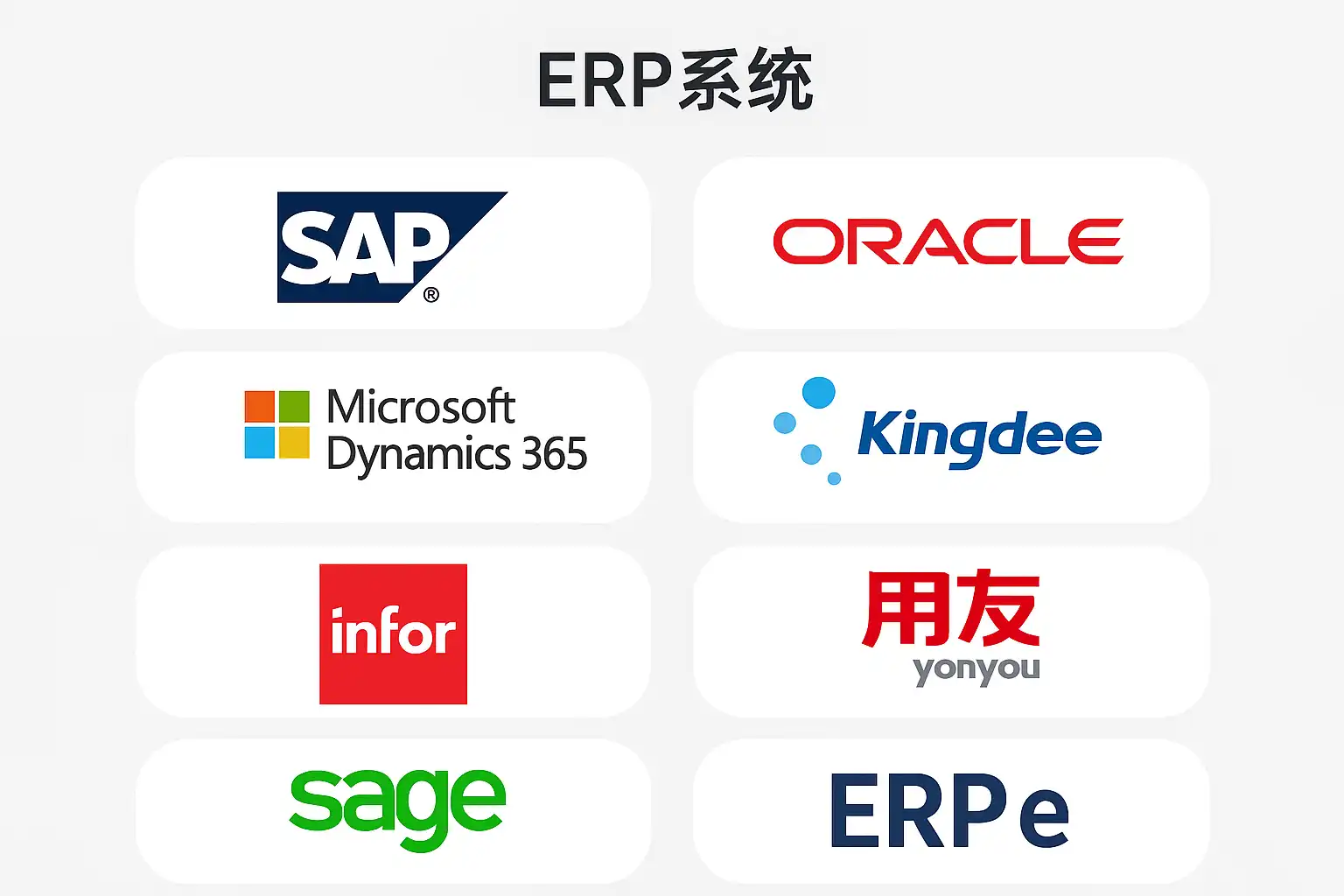 | 制造业 | 用友U8/NC, 金蝶EAS | SAP S/4HANA, Oracle EBS |