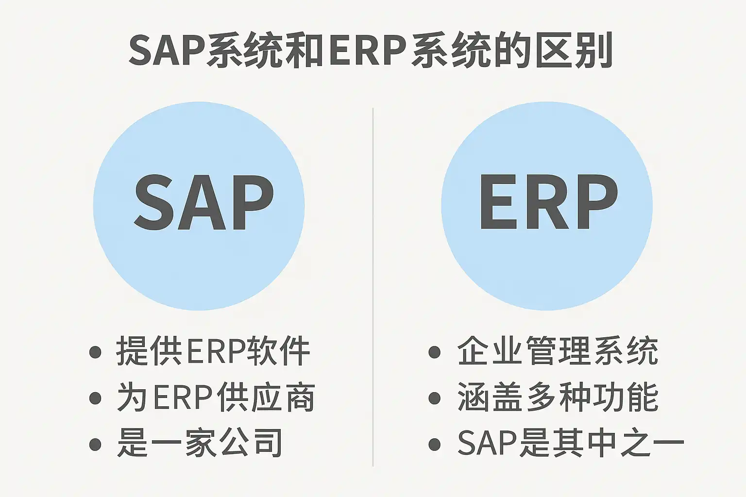 - 两者关系 | 项目 | SAP | ERP | | :---: | :---: | :---: | | 概念范畴 | 品牌/厂商/具体产品 | 管理软件类别 | | 是否专指某一公司 | 是(指德国SAP公司的产品)| 否(泛指同类产品)| | 举例 | SAP ECC, SAP S/4HANA | 用友U8, Oracle EBS, 简道云ERP |