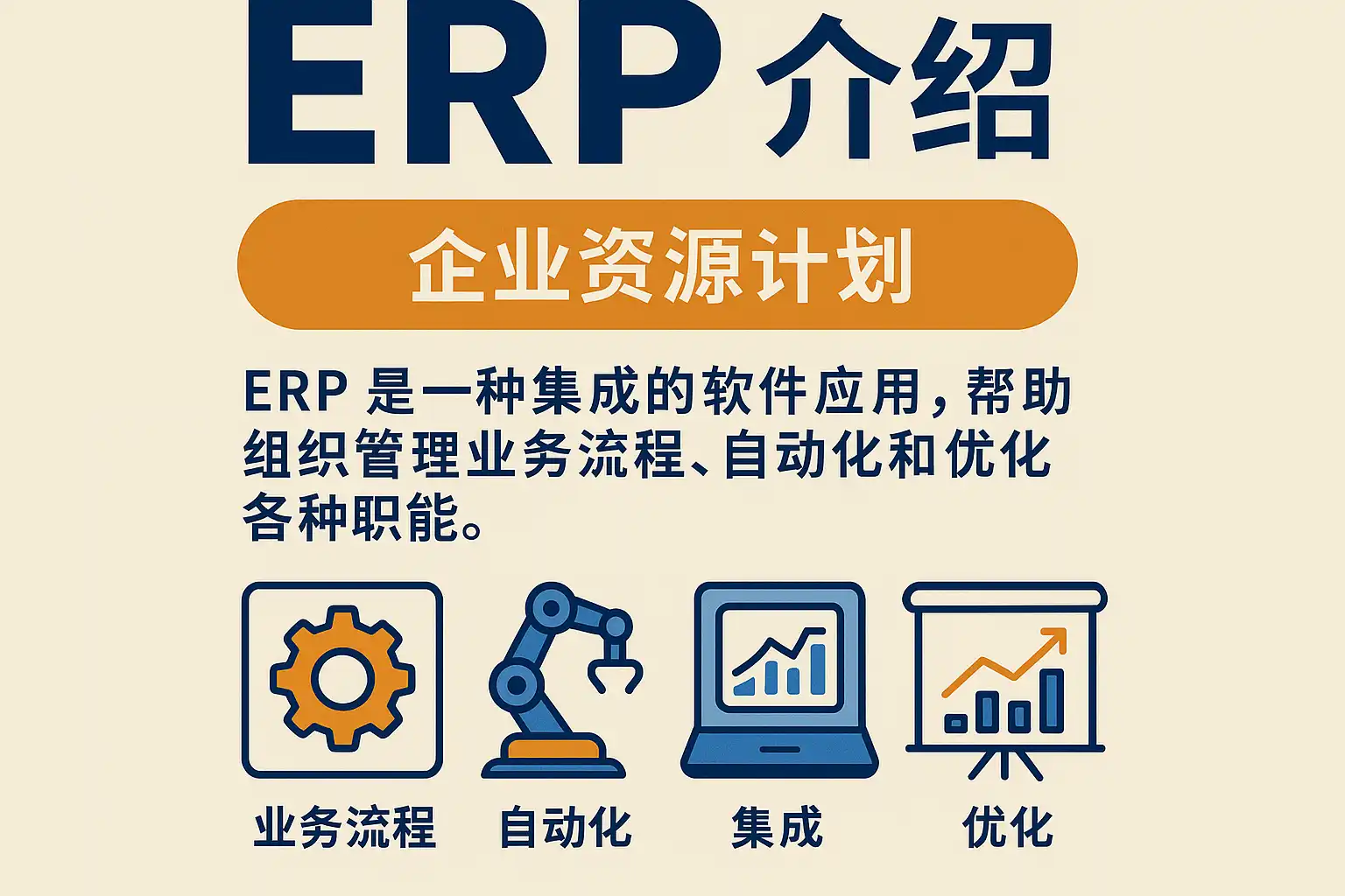 ERP定义 ERP(Enterprise Resource Planning,企业资源计划)是企业综合性管理软件,通过集成财务、人力资源、采购、库存、销售和生产等业务流程,实现数据共享与流程自动化,提高运营效率和决策科学性。