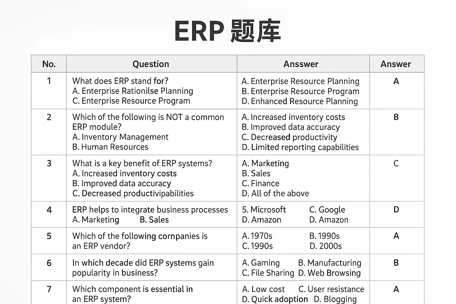 - 数据驱动培训调整:通过分析考试数据调整培训内容和难度。数据显示,通过系统化使用ERP题库,公司员工平均操作错误率下降25%,整体效率提升15%。