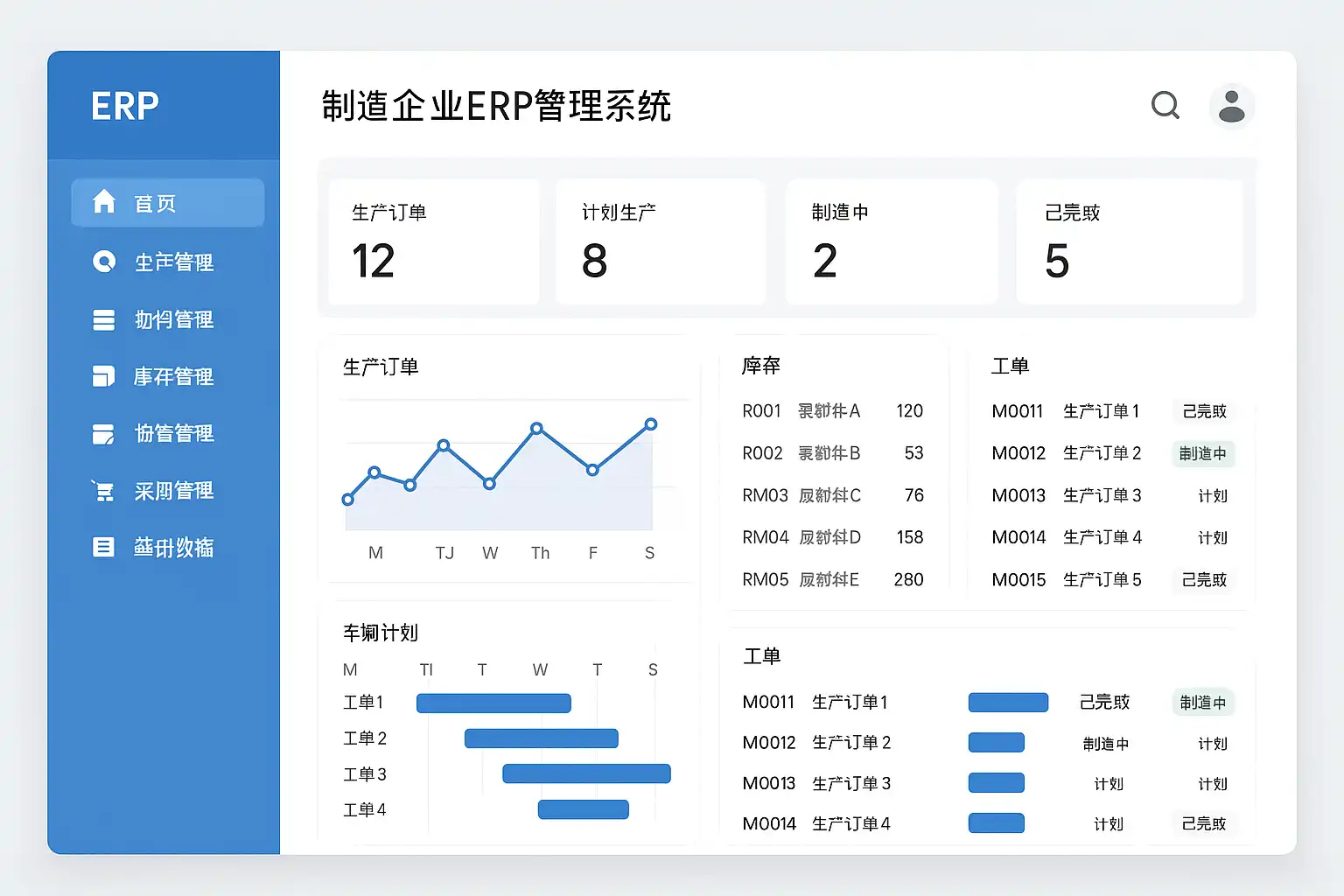 - 生产计划:主生产计划(MPS)、物料需求计划(MRP)、车间调度排程。