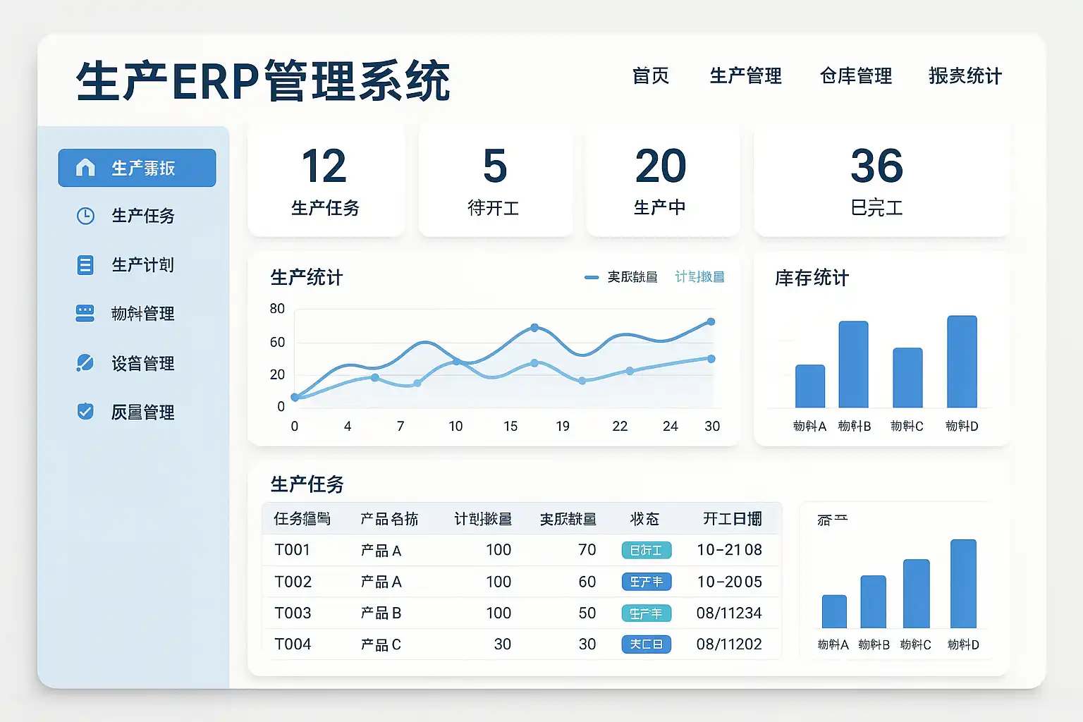 生产ERP(Enterprise Resource Planning,企业资源计划)管理系统专为制造业及相关行业设计,是整合企业内部各项资源,实现信息流、物流、资金流统一管控的信息平台。主要功能覆盖采购、库存、生产计划、车间执行、质量管理及财务等多个核心模块。