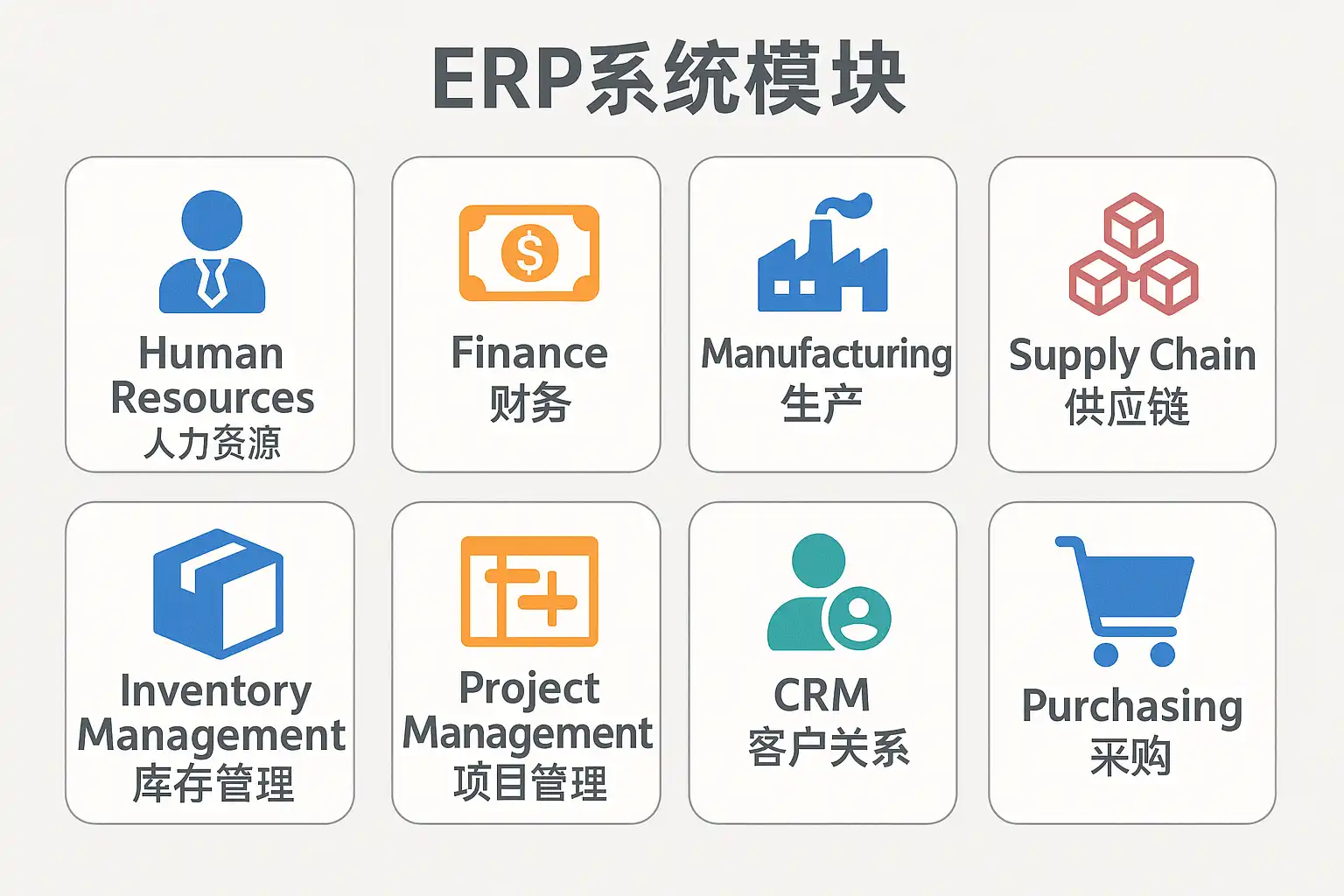 ERP(Enterprise Resource Planning,企业资源计划)系统通过集成不同业务板块的数据与流程,实现资源的全面协同和优化。其标准结构由多个功能性子系统组成,每个子系统即为一个“模块”,针对某一类业务进行深度支持。