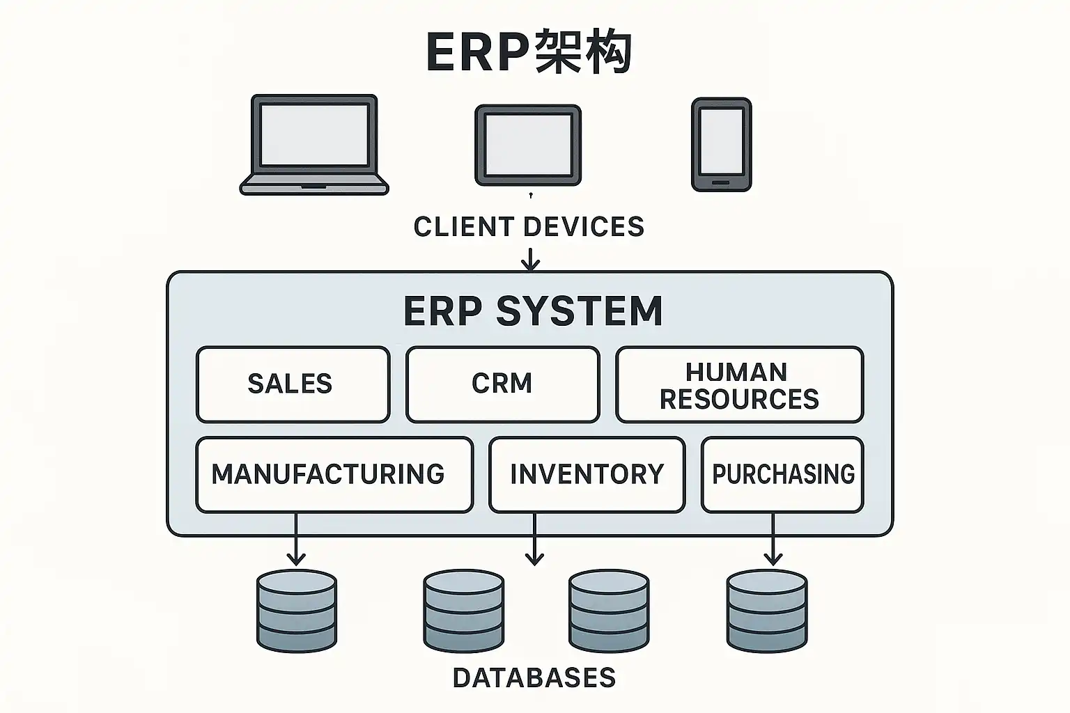 概念解析 ERP(Enterprise Resource Planning, 企业资源计划)系统是一套集成化的信息管理平台,通过统一的数据中心和业务流程,实现对企业人力、物资、资金等资源的全方位管理和优化配置。其“架构”指的是系统内部各功能模块如何协同工作,以及与外部系统如何对接的整体技术和业务结构。