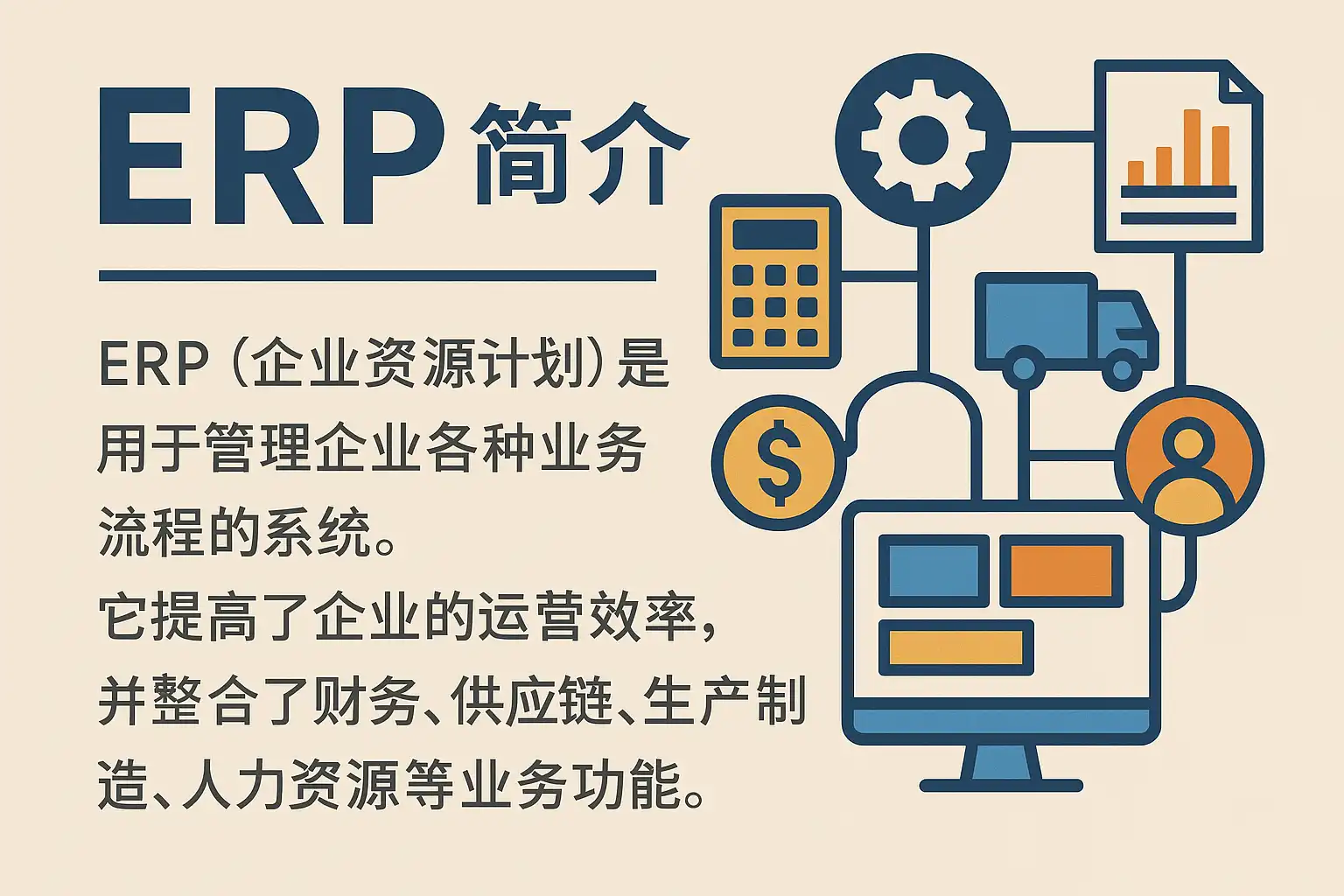 ERP(Enterprise Resource Planning,企业资源计划)是指通过信息技术,将组织内外部所有资源进行集成管理和协同运作,以实现业务流程优化和决策支持。它覆盖了生产制造、财务会计、人力资源管理、供应链管理等多个方面,为企业提供统一、高效的数据平台。