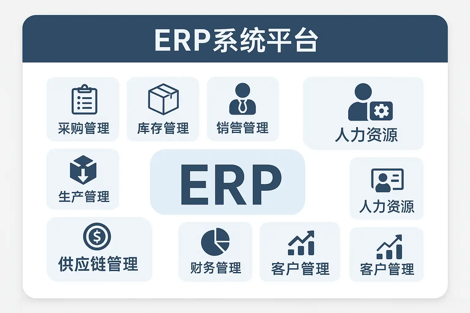 ERP(Enterprise Resource Planning,企业资源计划)系统平台是一种集成管理软件,其主要目的是实现企业资源(人力、物料、资金等)的统一规划与优化配置。不同厂商的ERP虽有差异,但一般都具备以下关键模块: