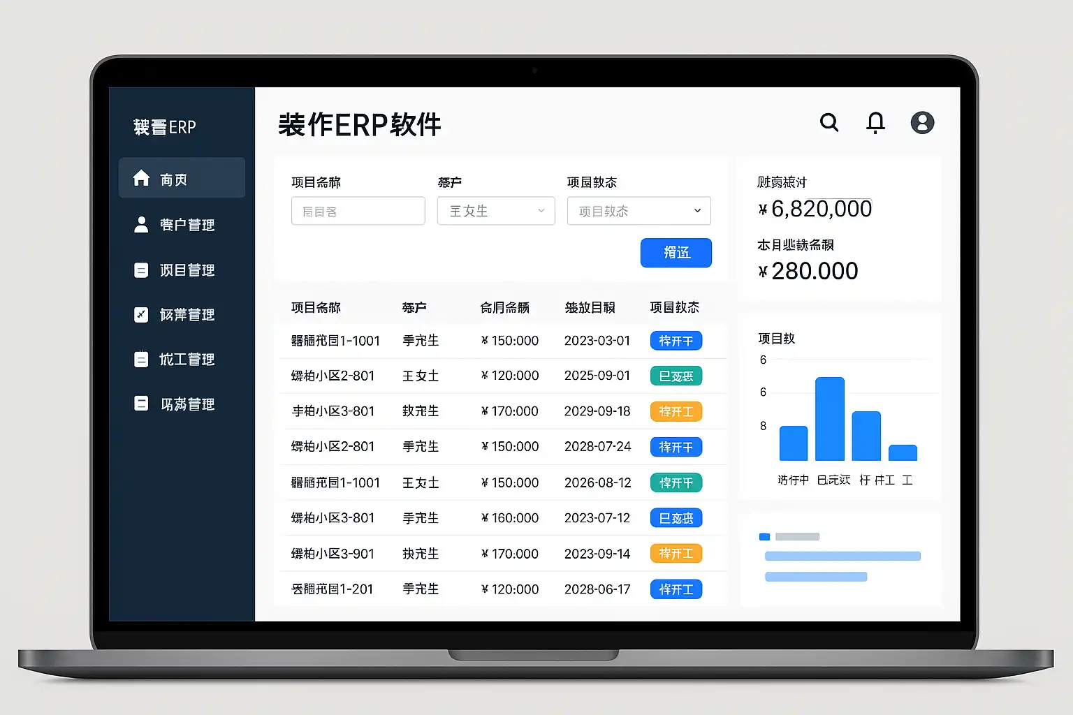 - 财务核算:集成成本核算和利润分析,提高财务透明度。 例如,一家中型装修公司使用装修ERP后,项目延期率下降了30%,材料浪费减少了15%,显著提升了运营效率。