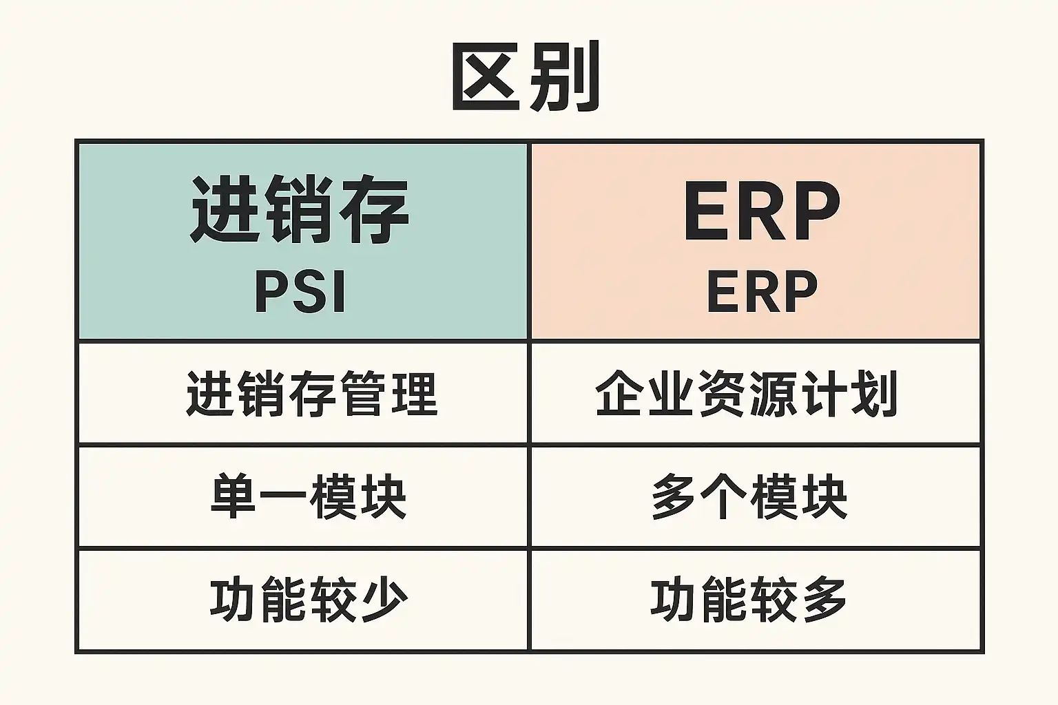 | 涵盖范围 | 采购、销售、库存 | 采购、销售、库存+财务、人力资源、生产制造等全业务流程 |