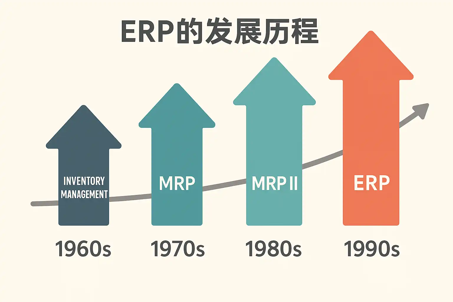 - 1960年代末:物料需求计划(MRP)诞生,用于优化制造业原材料采购与库存。