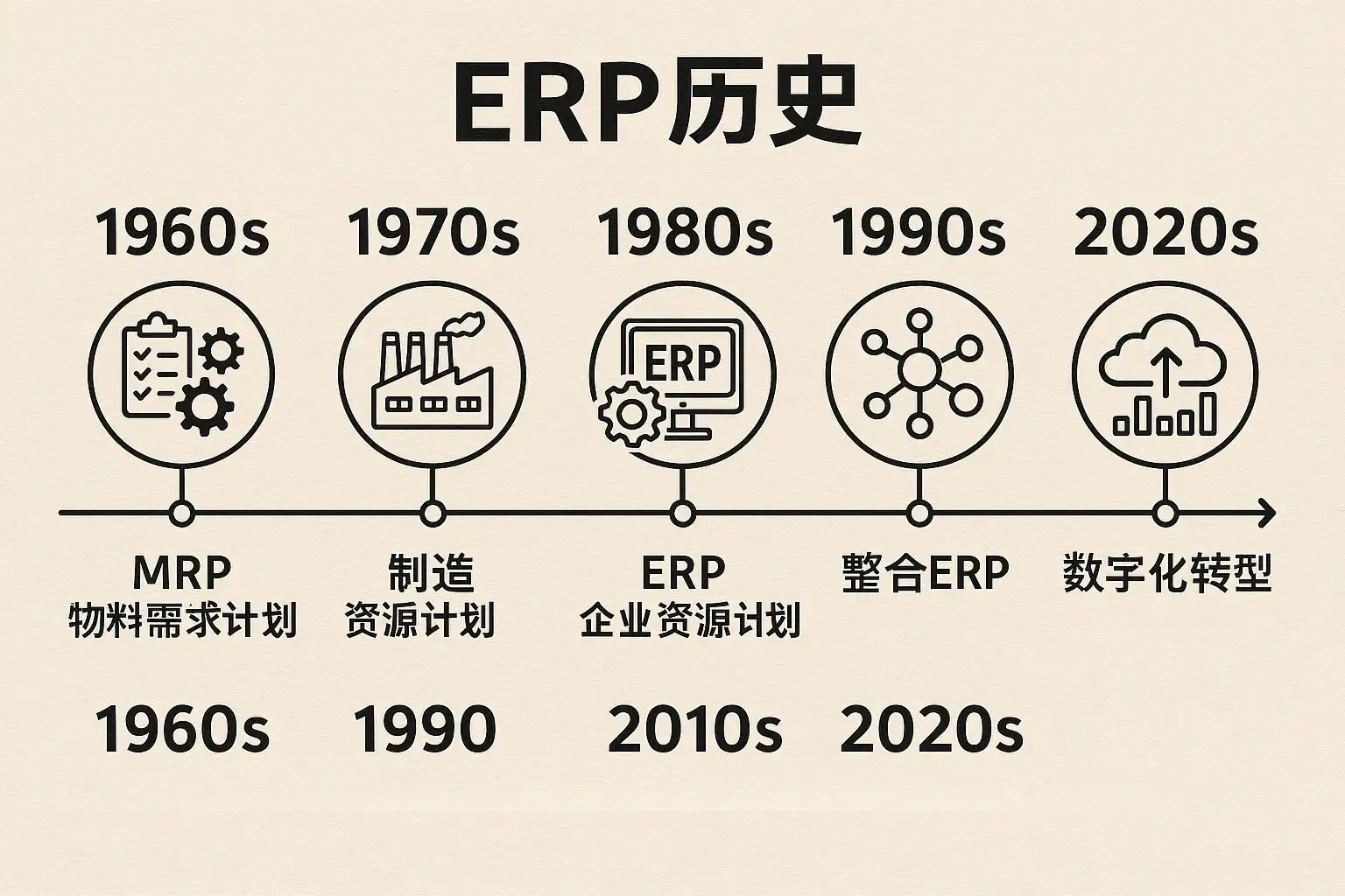 | 1980s-90s | 制造与财务集成 | MRP II、财务会计 |