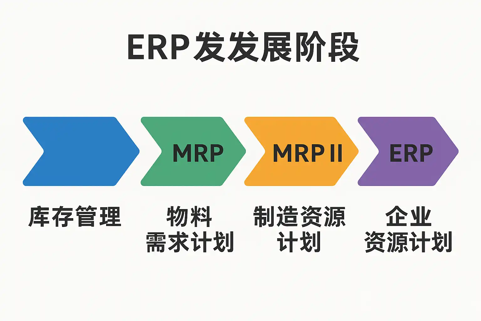 - 初始阶段(1960s-1970s):以物料需求计划(MRP)为核心,聚焦库存和生产管理。