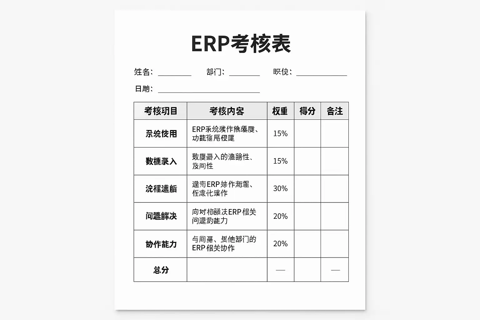 一份科学的ERP考核表需围绕企业运营实际,从多个角度全面评估系统实施与应用效果。常见的核心评价维度如下: