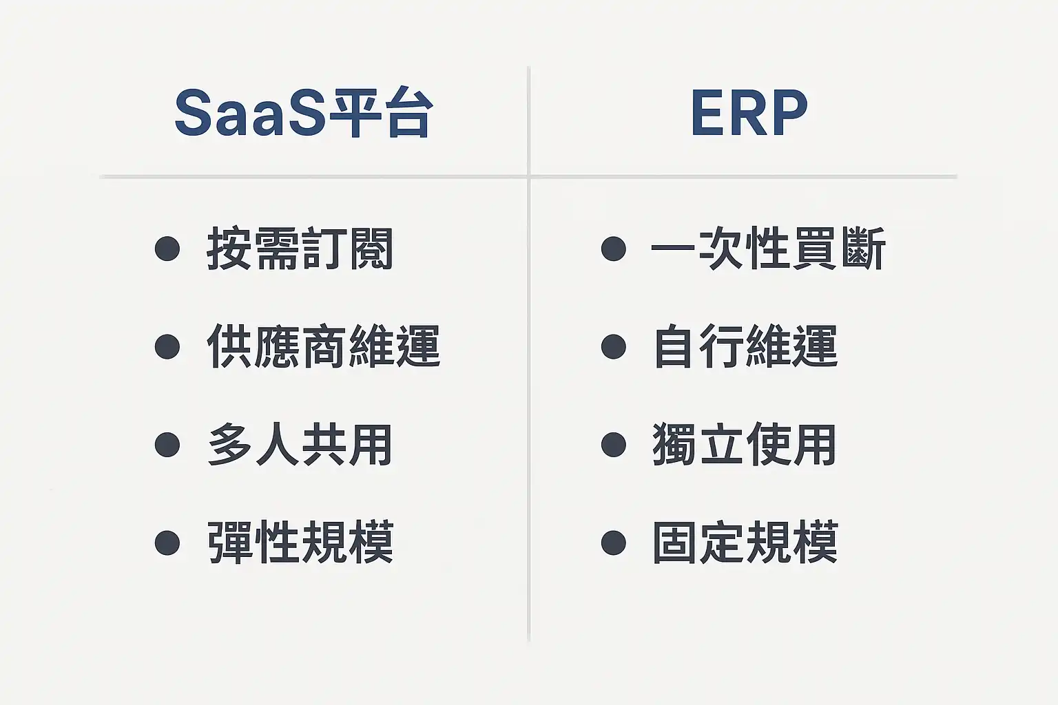 - ERP传统上更偏向“买断式”,需要自行运维,但也可以以“SaaS ERP”的形式提供。