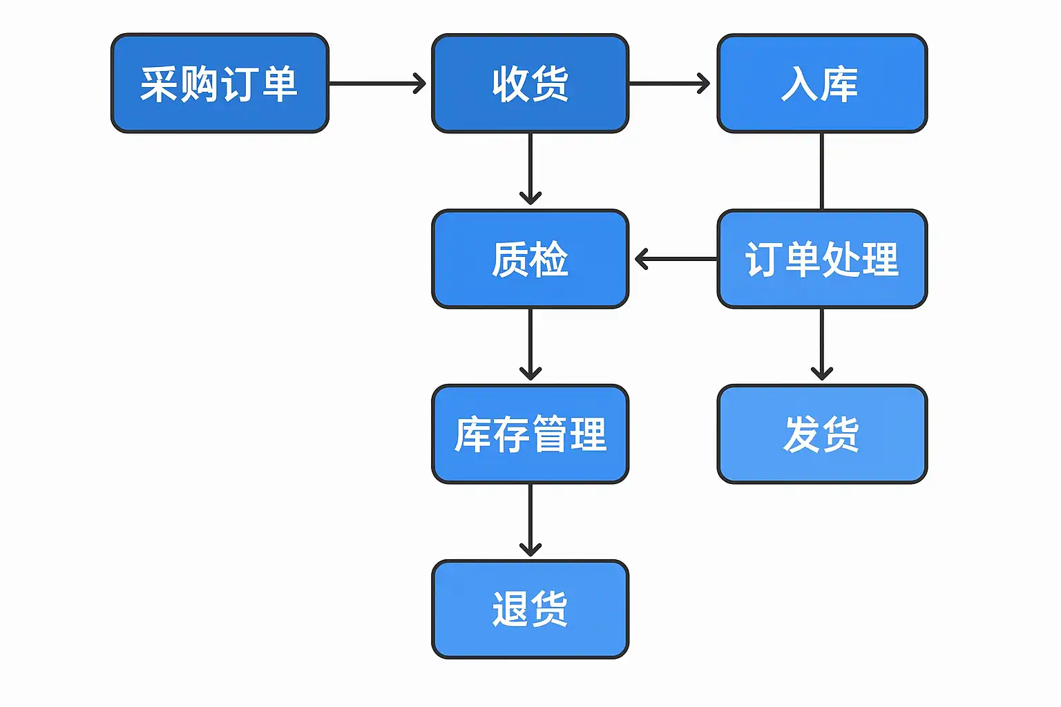 - 到货验收&质检: 收到物资后进行数量质量核查,不合格则走退换处理。