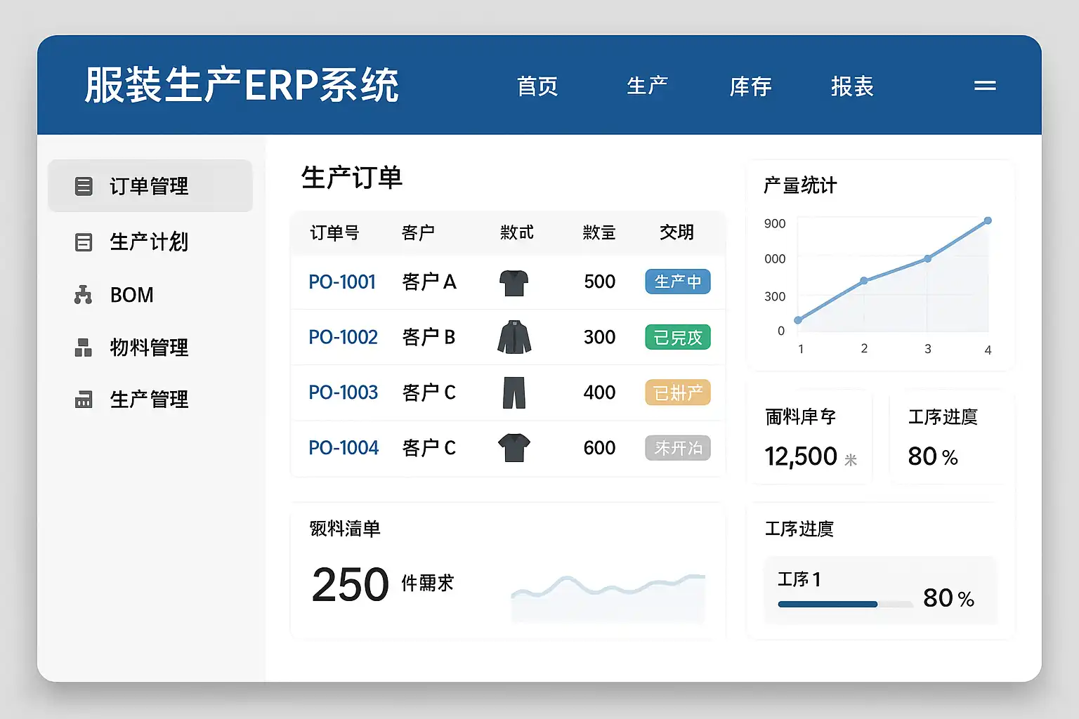 案例方面,一家中型制衣厂应用 ERP 后,实现月度原材料浪费率下降40%,成品库存周转天数从45天减少至28天,大幅提高资金利用效率。