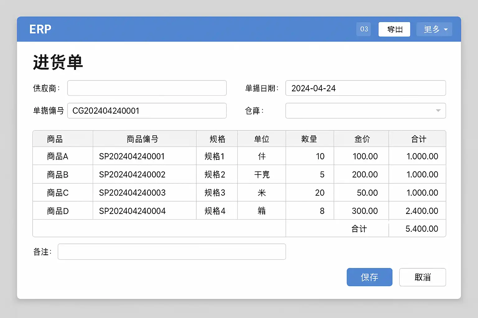 定义 ERP进货单是指在企业资源计划(Enterprise Resource Planning)系统中,用于记录和追踪原材料、商品等采购入库明细的业务凭证。它是连接采购、仓储和财务的重要纽带。